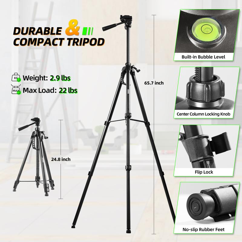 ·Bonus Compact Laser Tripod: The tripod is made of thickened and widened aluminum alloy material, stable and durable; It can reach 65.7 inches when fully unfolded, and the flip lock design allows height adjustment arbitrarily; Measures only 25.6 inches when collapsed for easy storage; In addition to the regular 1/4" quick release plate, a 5/8" adapter is included, you can install and remove the laser level in seconds