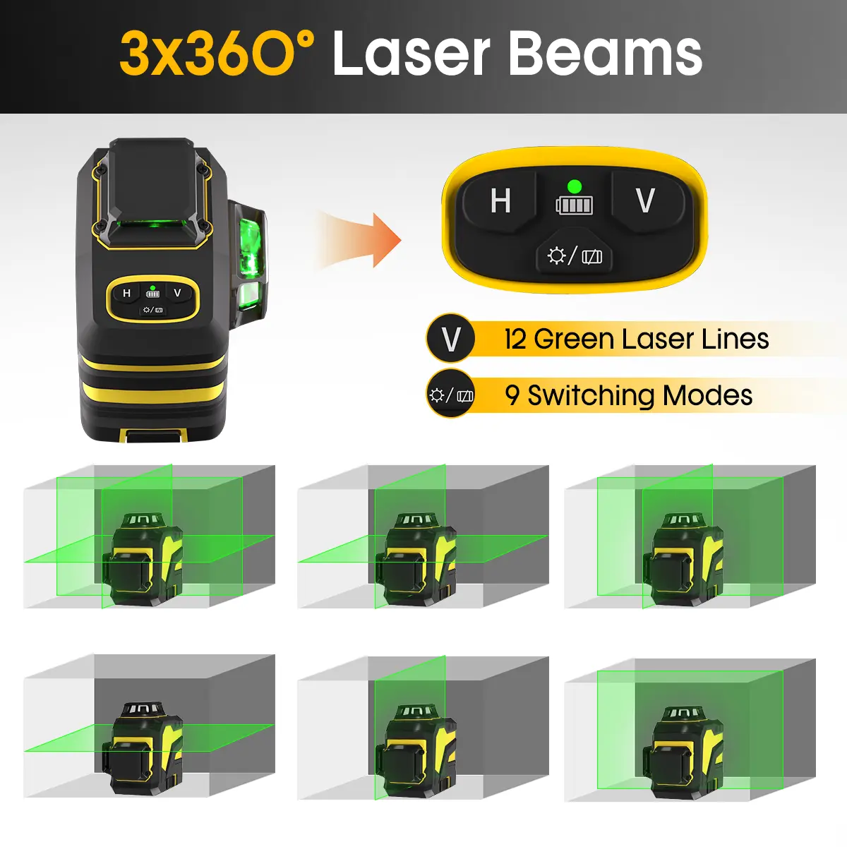 ·【3X360° Lasers Full Layout】 1x360° horizontal and 2x360° vertical , which can cover all around the room. "H" stands for horizontal laser, "V" stands for vertical laser, you can easily switch any laser you want.