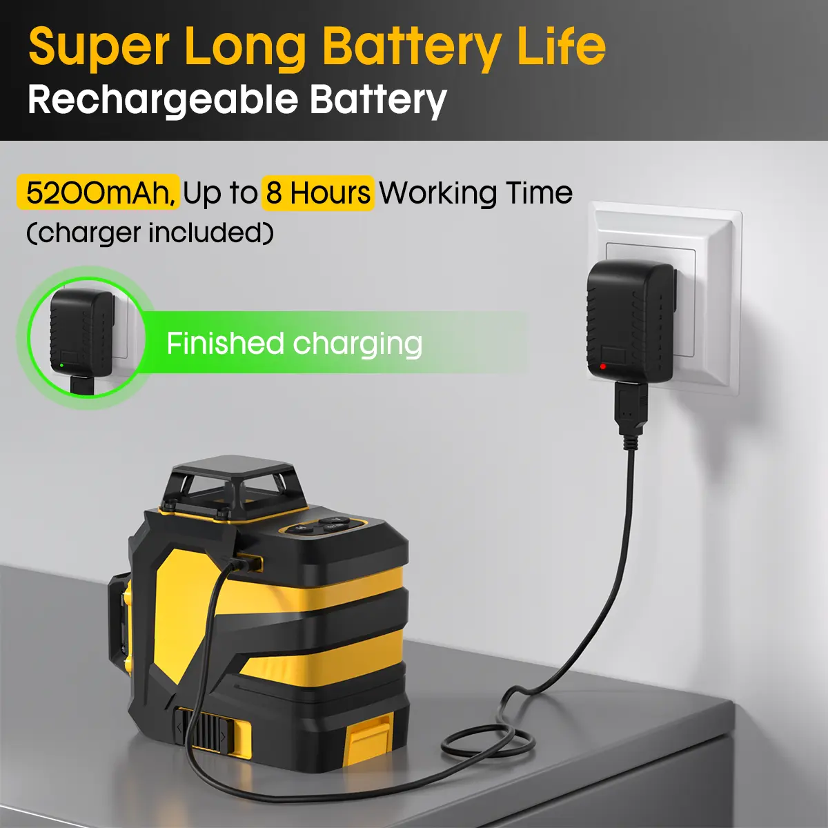 ·【5200 mAh Large Capacity Battery】The line lasers is equipped with a large-capacity battery, which can working up to 8h. When the battery power is low, the battery indicator will turn from green to red, also comes with charger, charger indicator on red - charging; charger indicator on green - charging completed.