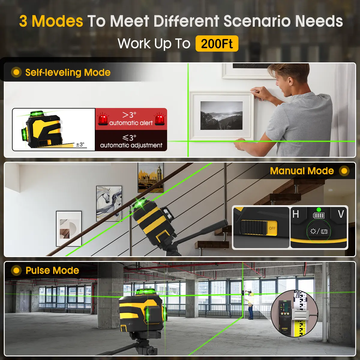 ·【Pulse Mode】The laser level has two kinds of green lasers (weaker, stronger), switching to the weaker lasers - Pulse Mode is turned on, the indicator light will flash continuously. laser level can be used in various indoor and outdoor scenes, you can also adjust the laser brightness according to the use environment.