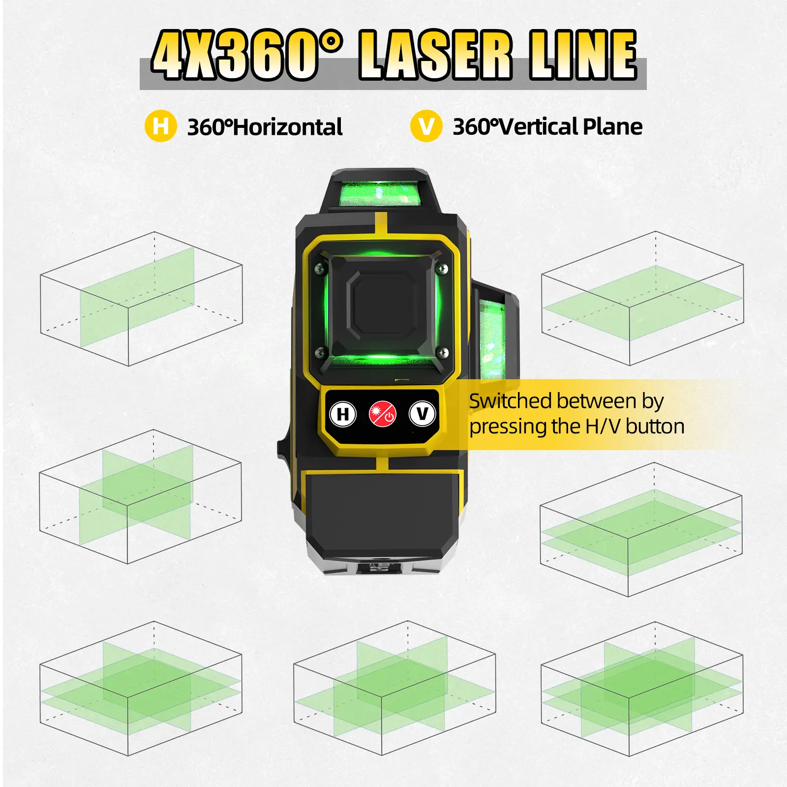 ·4×360° Green Laser Lines: 2 horizontal + 2 vertical planes for a perfect 90° cross layout.