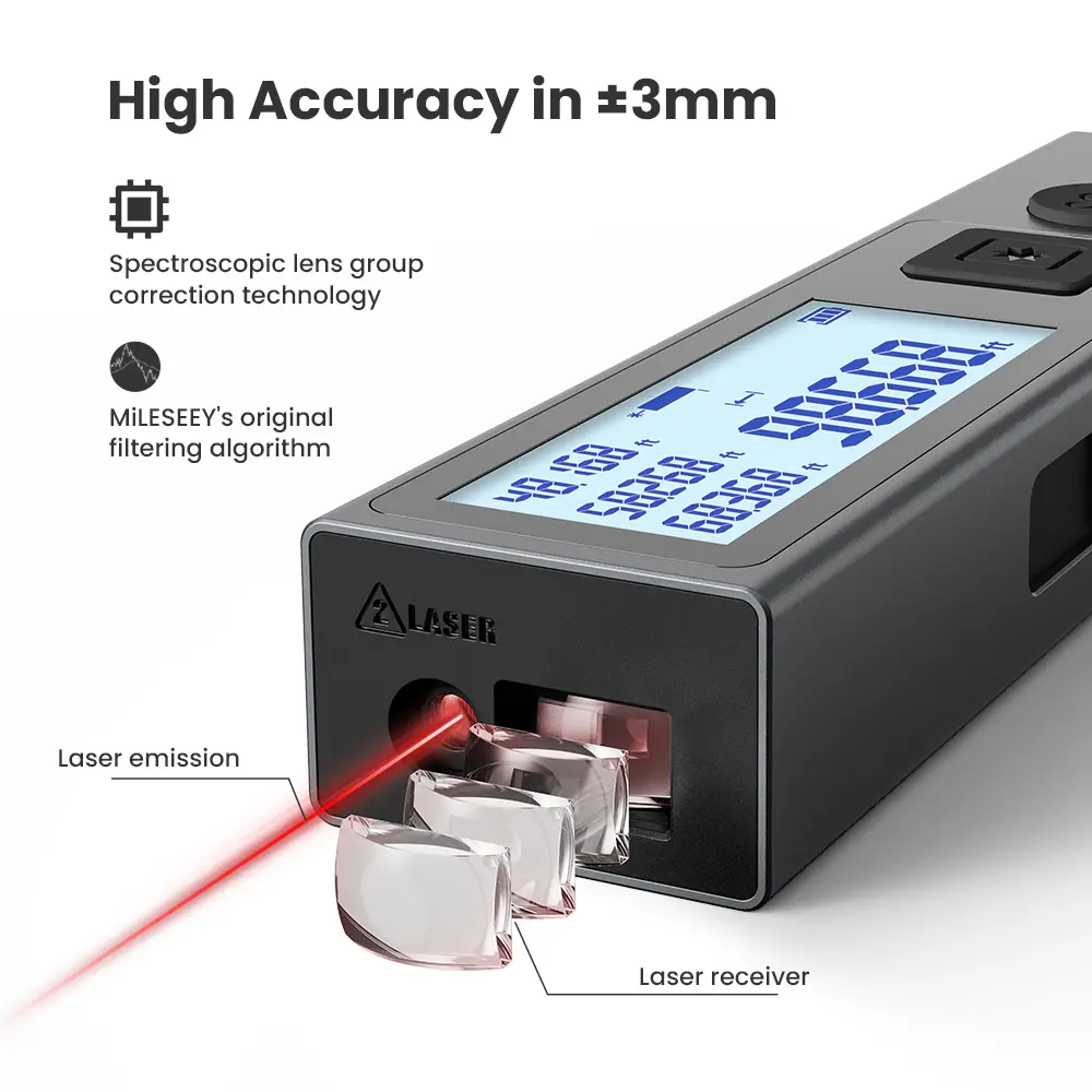 ·【Accurate and Reliable】M120 integrates the advanced optical focusing lens with high light transmittance,high refractive index, and great impact resistance to maintain laser stability. Its advanced free-form optical technology greatly enhances reflection light reception,and taking instantand reliable measures distances up to 98 feet within 1/8 inch accuracy