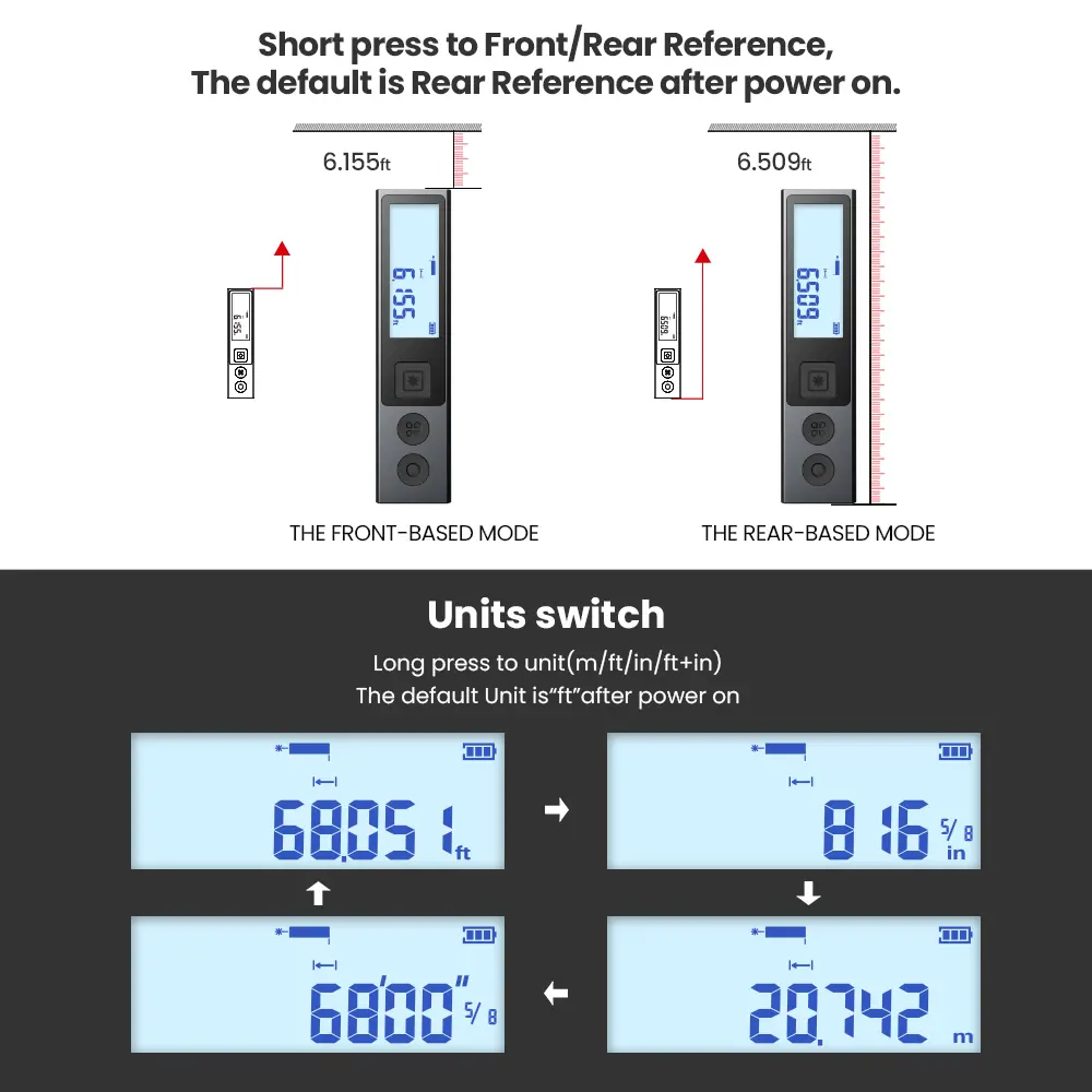 ·【HD Display and Clear Reading】This electric tape measure with HD backlight LCD screen.Extra 50% larger screen for easy and clear reading,3 sets of data are display at the same time.Avivid measure mode icons and also with large numbers.Units (m, in, ft) are free to be switched