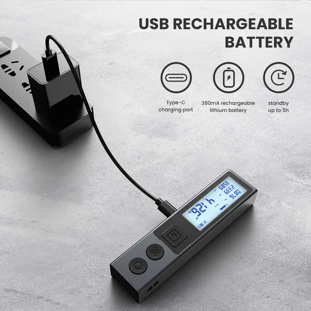 ·【Rechargeable Battery】The laser tape measure built with large capacity rechargeable lithium battery,it can be powered by power bank, computer,car charging or DC plug via USB .It's very environment friendly and durable