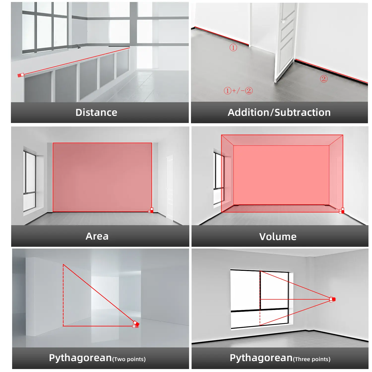 Multiple Measurements Features- Distance, Area, Volume: Measures distance, area, and volume.- Continuous Measurement: Records maximum and minimum values.- Pythagorean Mode: Adds and subtracts modes for effective calculations.