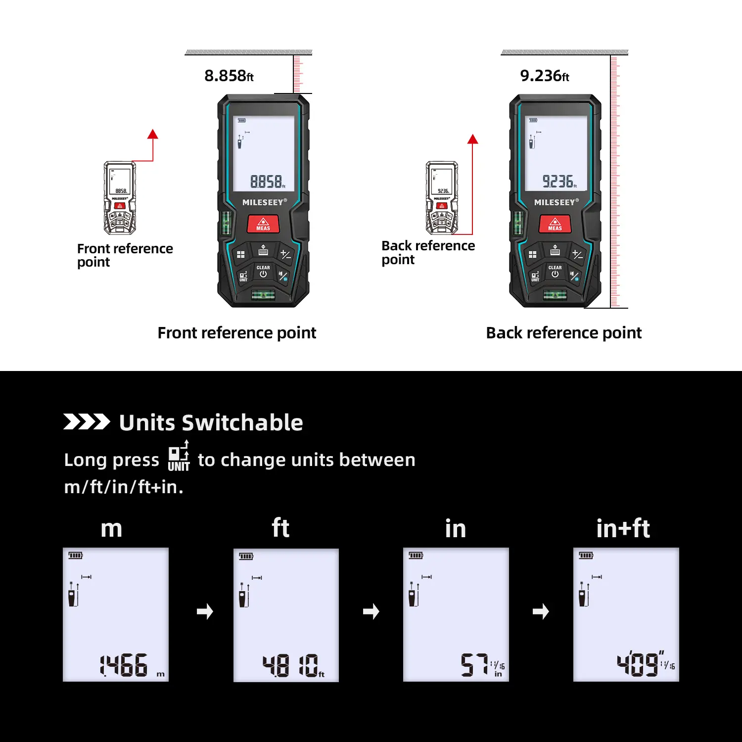Units Switch and 30 Data Records- Unit Switching: Freely switch between M/ FT/IN/ft+in.- 30 Data Records: Recall function for reviewing and calculating.- Portable Design: Pocket-sized with a non-slip design.- Automatic Shutdown: 180 seconds of automatic shutdown to save power.- Durability: Can work up to 5000 times.