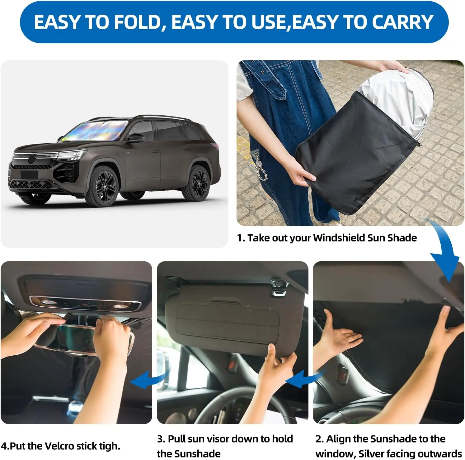 This cool front window sunshade can easily pop open and be installed in seconds. It can also be easily folded and stored in the included bag, making it easy to put into the door pocket. Very suitable for lazy people who use foldable windshield sunshade solutions for daily use