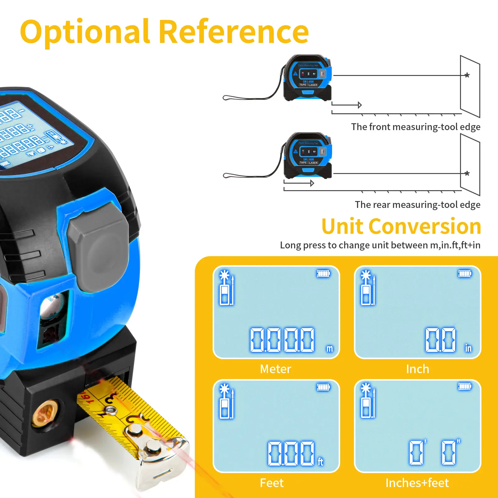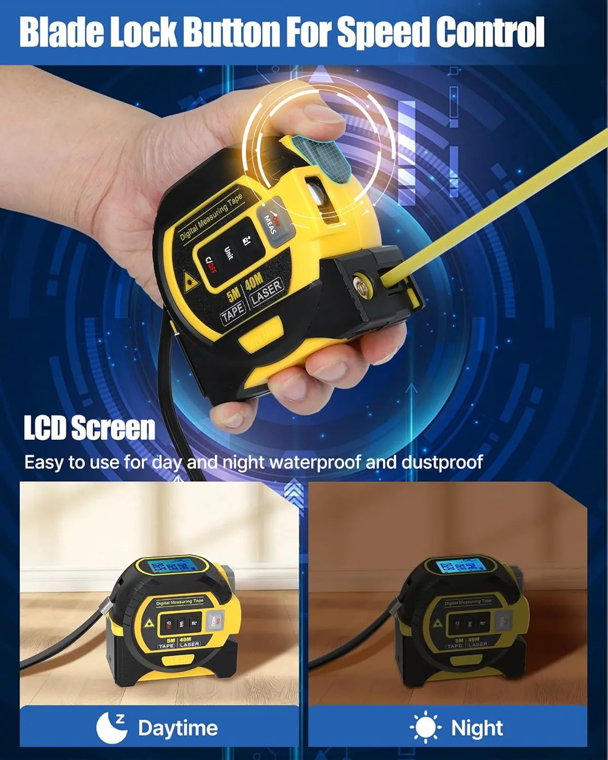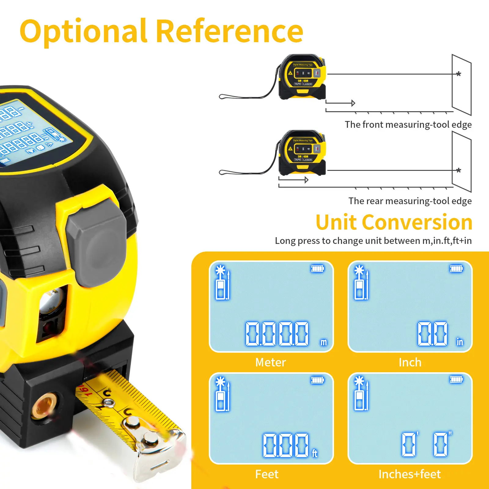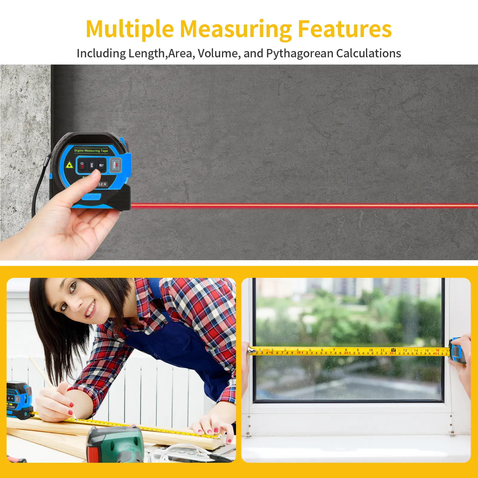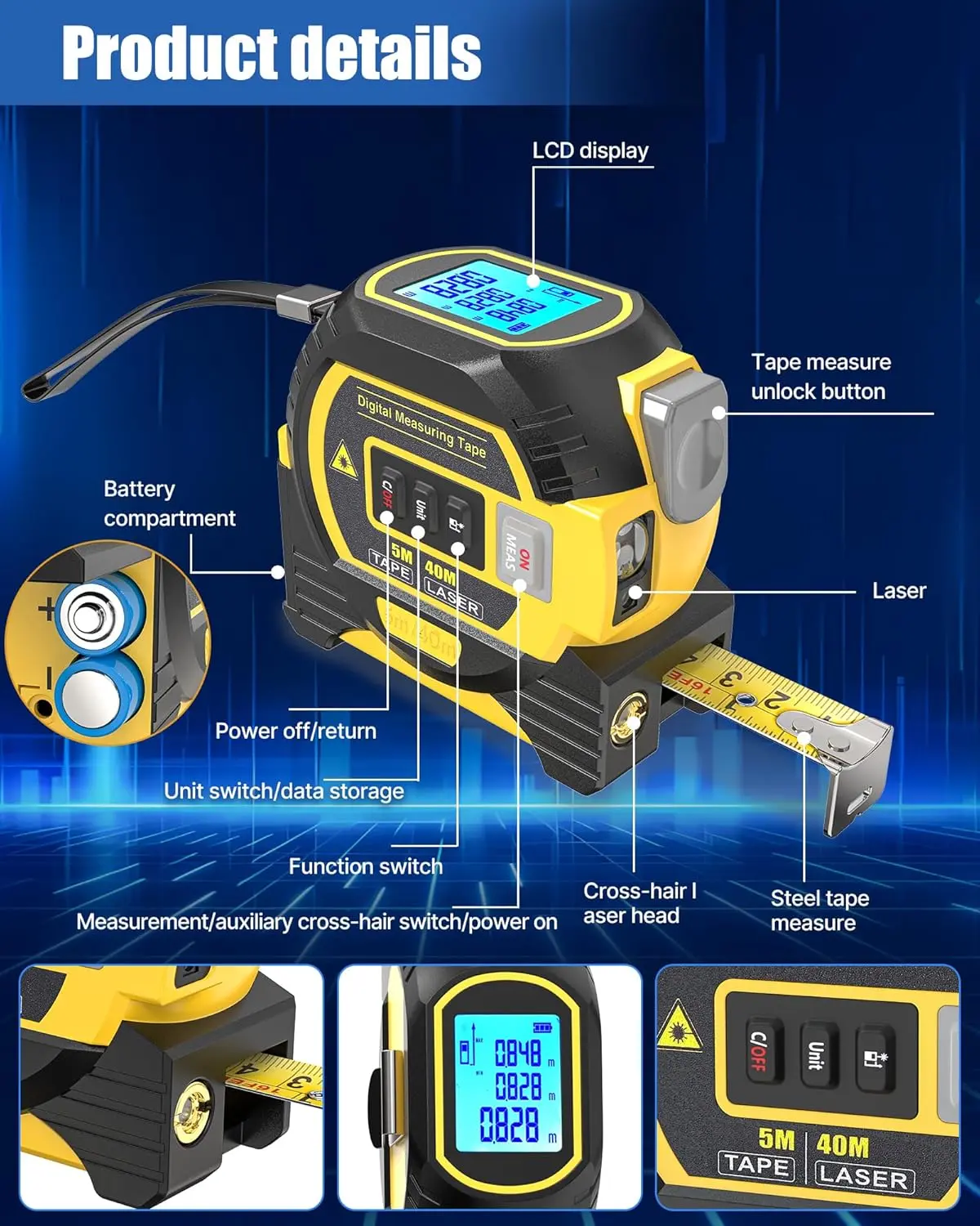This innovative laser tape measure combines three functions in one device. It's a digital measuring tape, a laser rangefinder, and a steel tape measure. Perfect for professionals and DIY enthusiasts, it offers versatility and precision. The device features a clear display for easy reading and a durable design for reliable use. It's a must-have tool for any project.