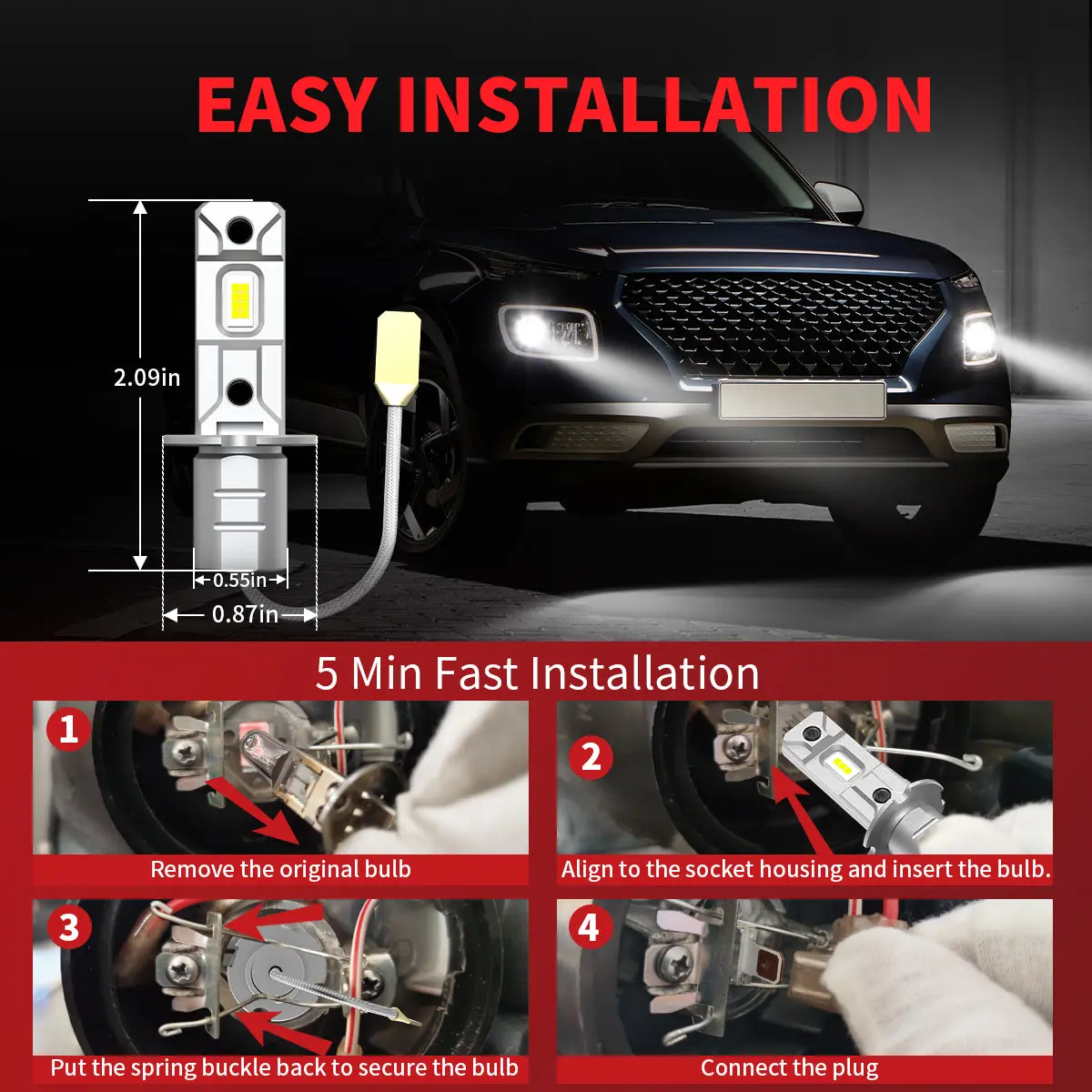 Optimized Beam Pattern: This L1plus series bulb has 1:1 halogen filament design, apply for the same length and position as the halogen bulb. It focuses light to match the standard beam pattern and does not blind oncoming traffic, no dark spots, or foggy light.