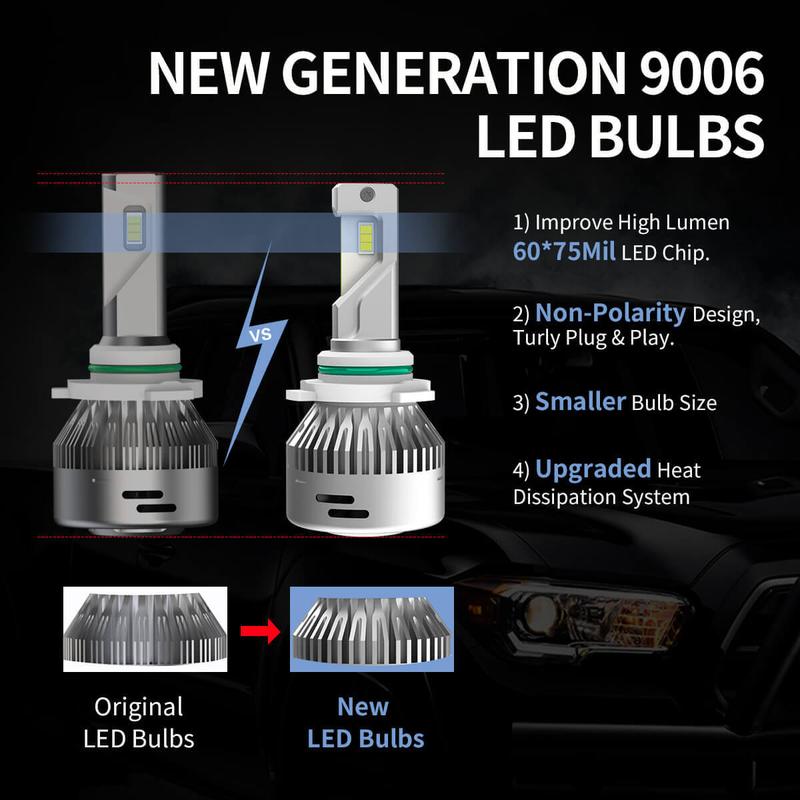 The shorter size of these bulbs will leave more space between the dust cap and the cooling fans for better heat dissipation. New cooling system with a unique dual ball-bearing fan preventing the driving from the loud noise from the cooling fan, the all-in-one compact aluminum design brings better heat dissipation than common plastic design, and intelligent IC make sure the LED conversion kits last longer.