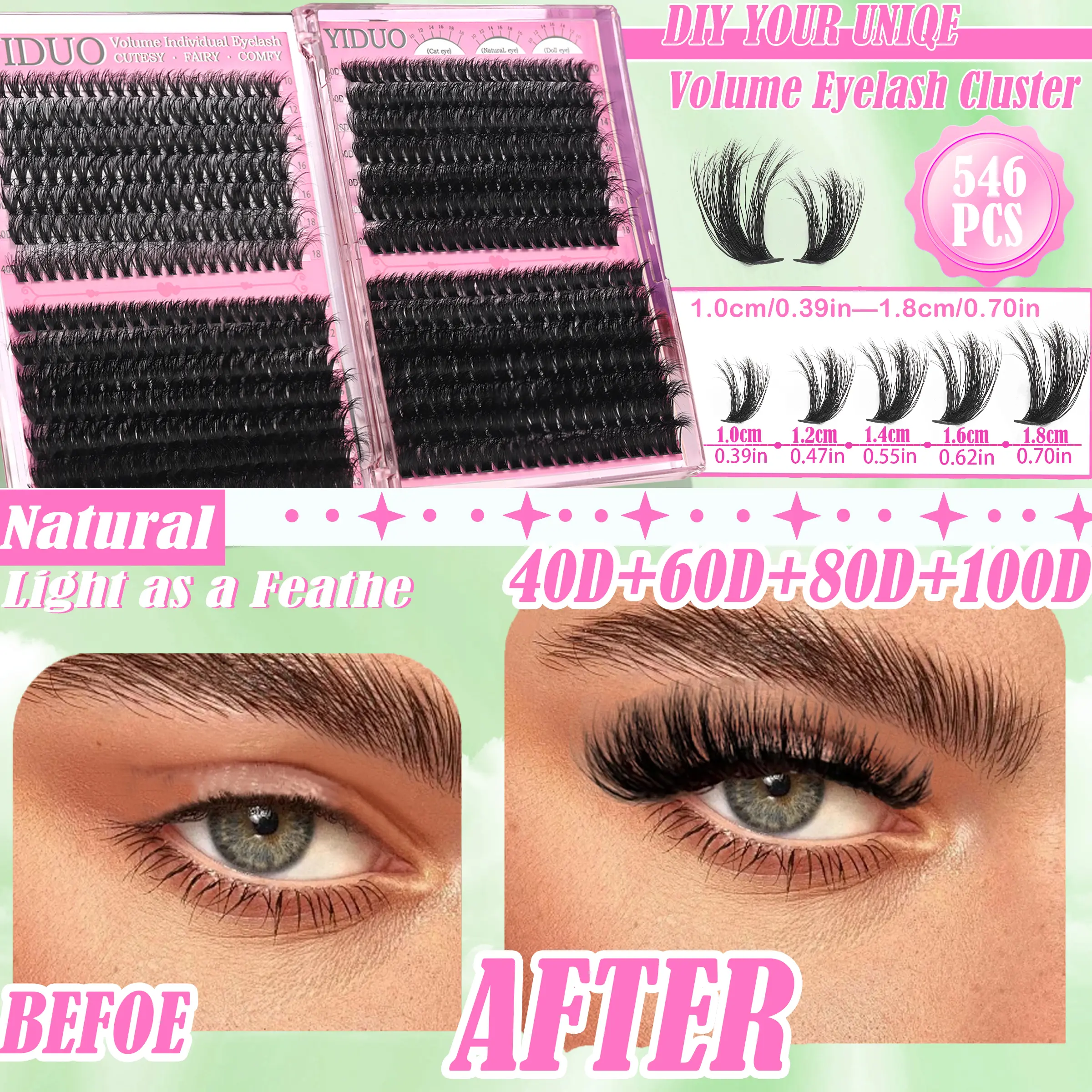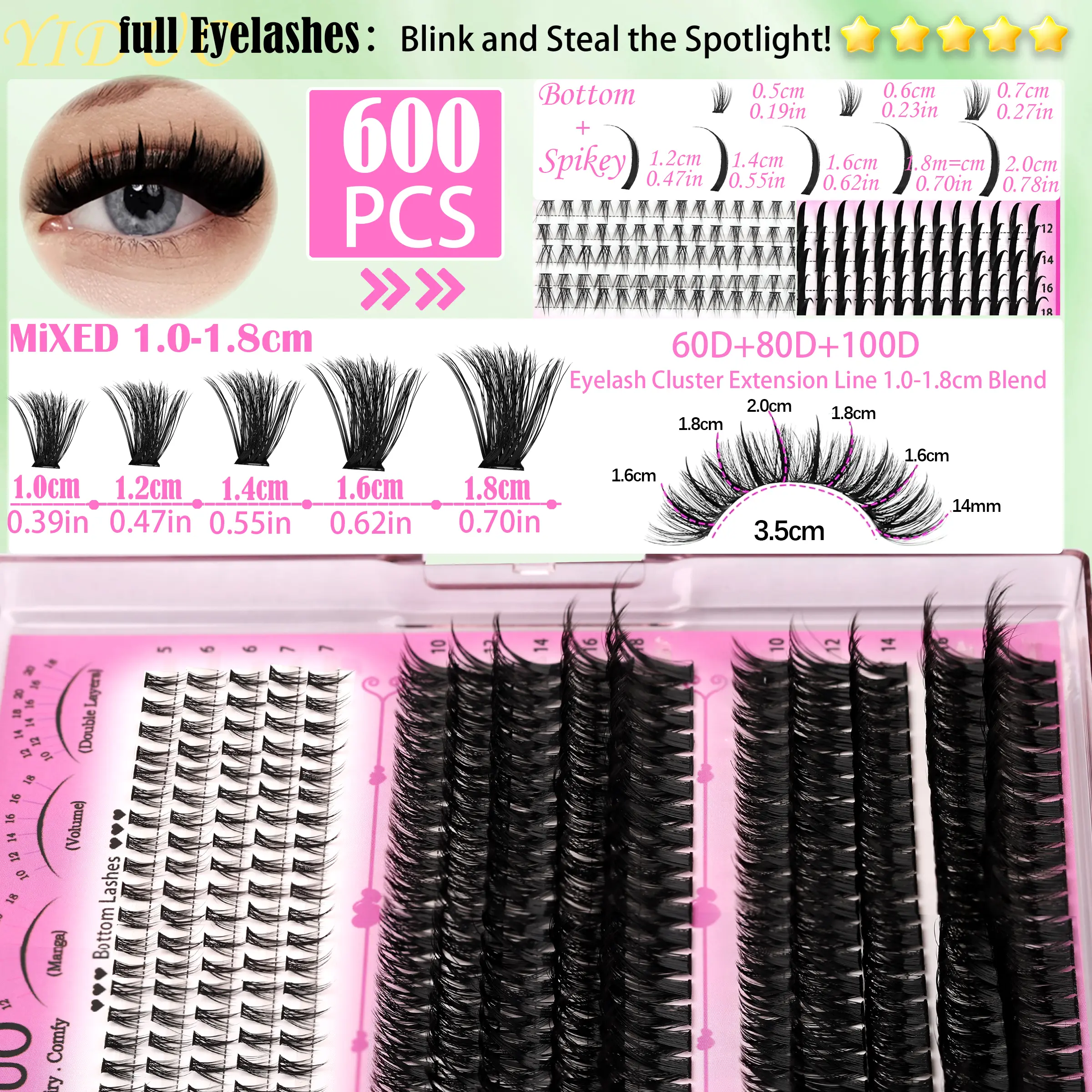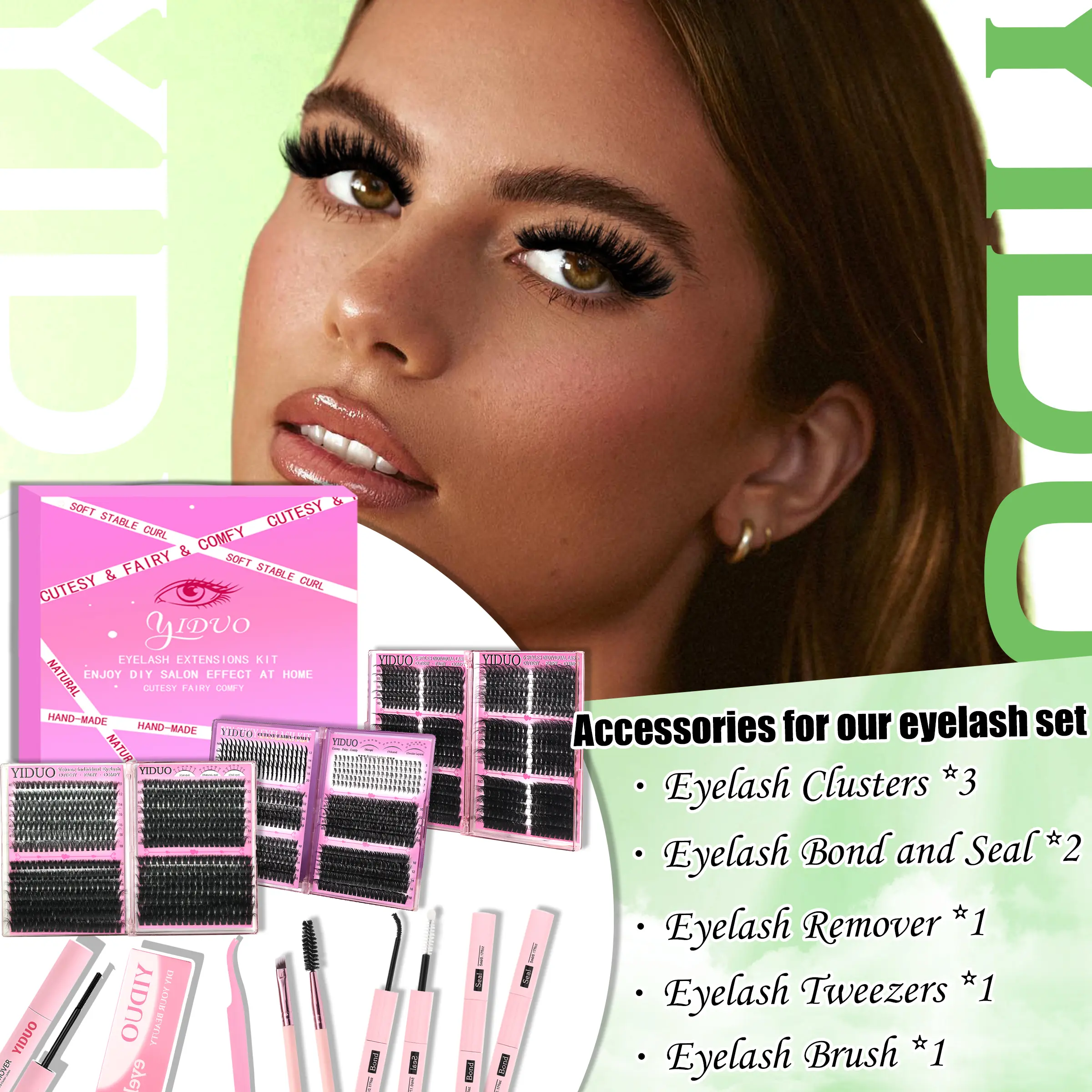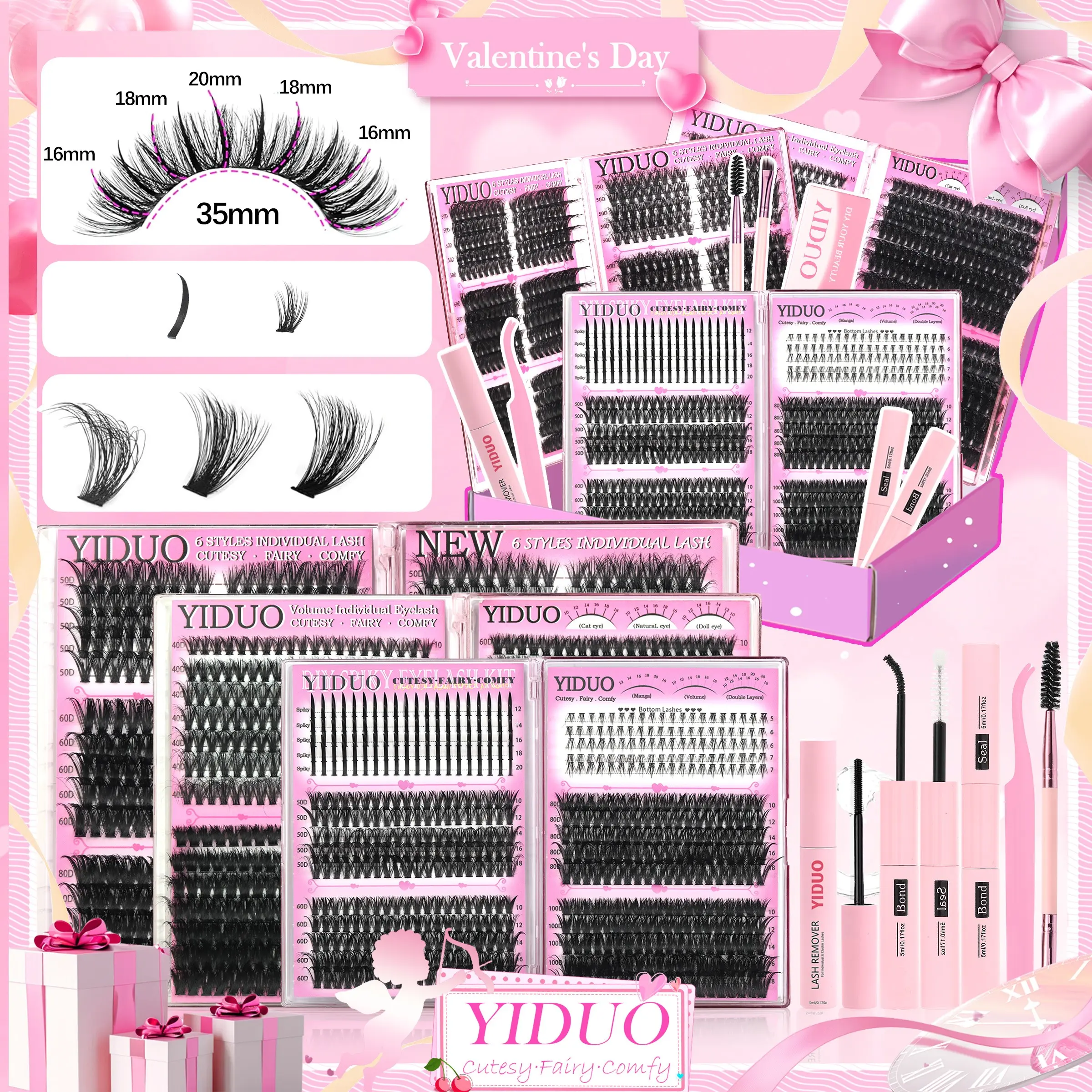 YIDUO Kit Gift Packs 6 boxes Mix Styles DIY Individual Lashes 1846Pcs Lash Clusters Eyelash Extension Kit, Volume/ Mega/ Full/Spikes/Bottom Extensions Kit With Bond and Seal makeup tools with Everything You Need for Beginners and Proficient, DIY at Home