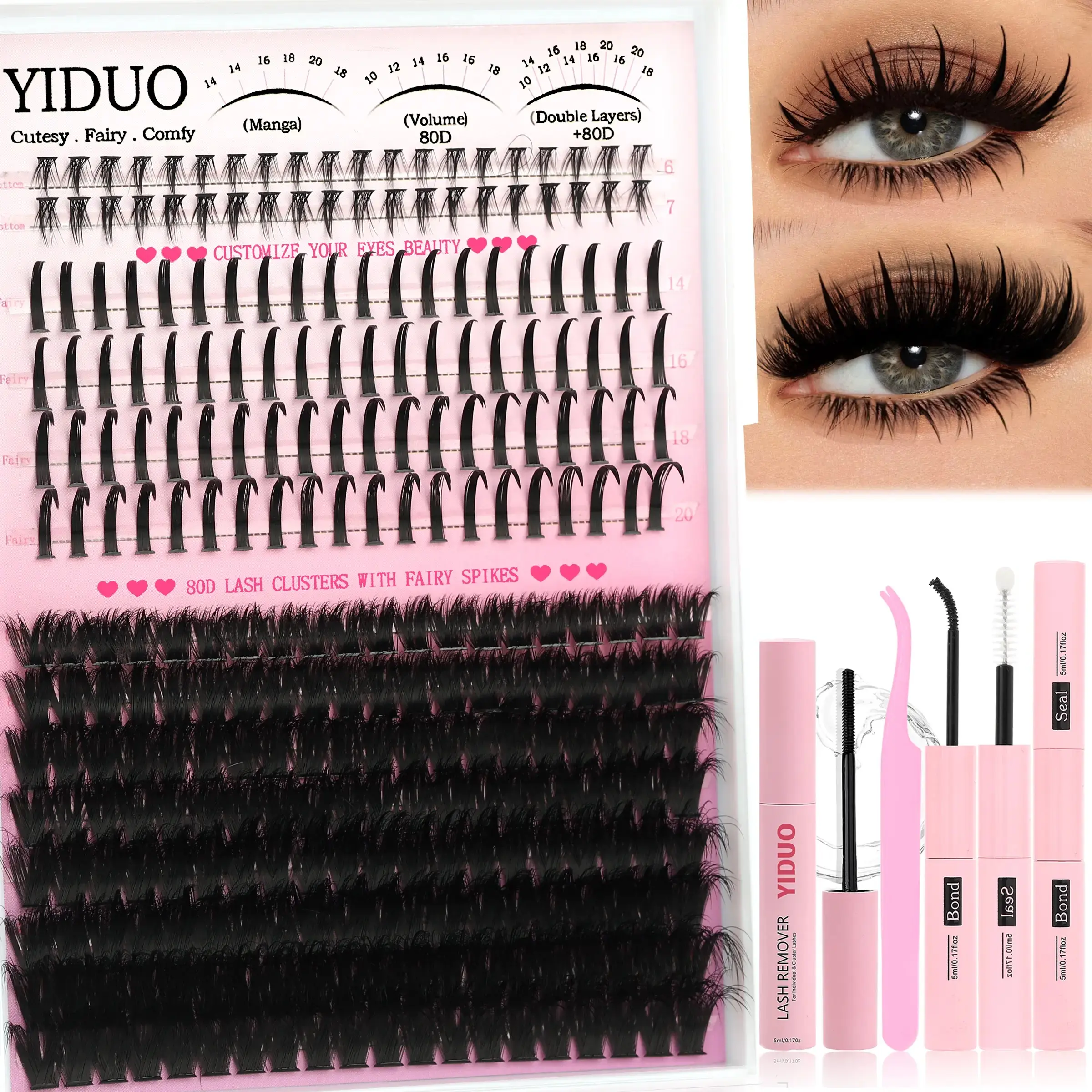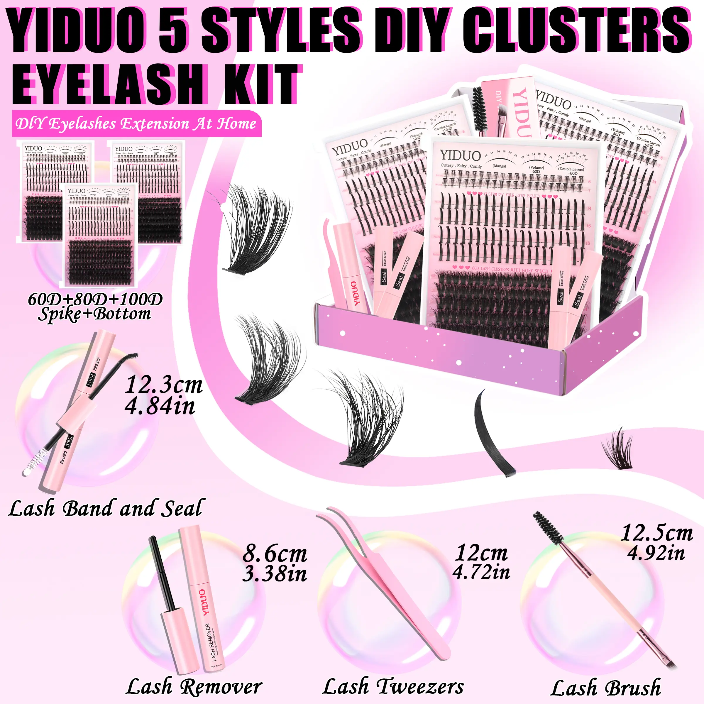 5. YIDUO Diy Eyelash Extensions 5 Styles Lashes Kit 60D\80D \100D\Spikes Eyelash and Bottom Lashes Clusters Kit 6-18mm Cluster Eyelash Extension Kit 840 Pcs D-Curl With Lash Bond and Seal, Lash Remover,Lash Tweezers,Eyelash Brush
