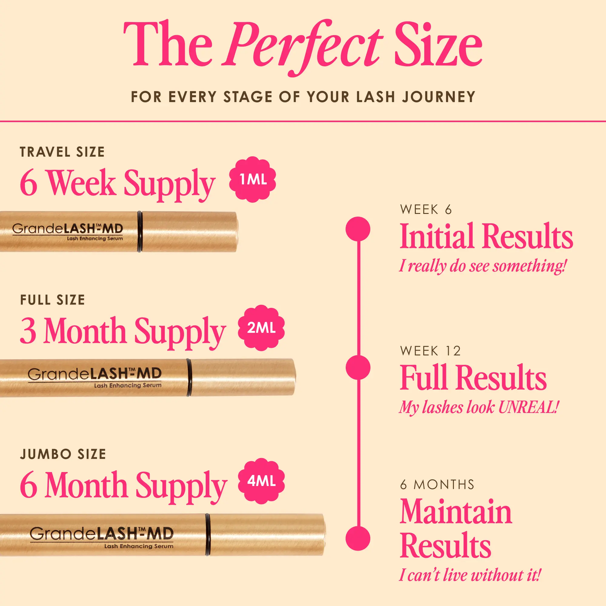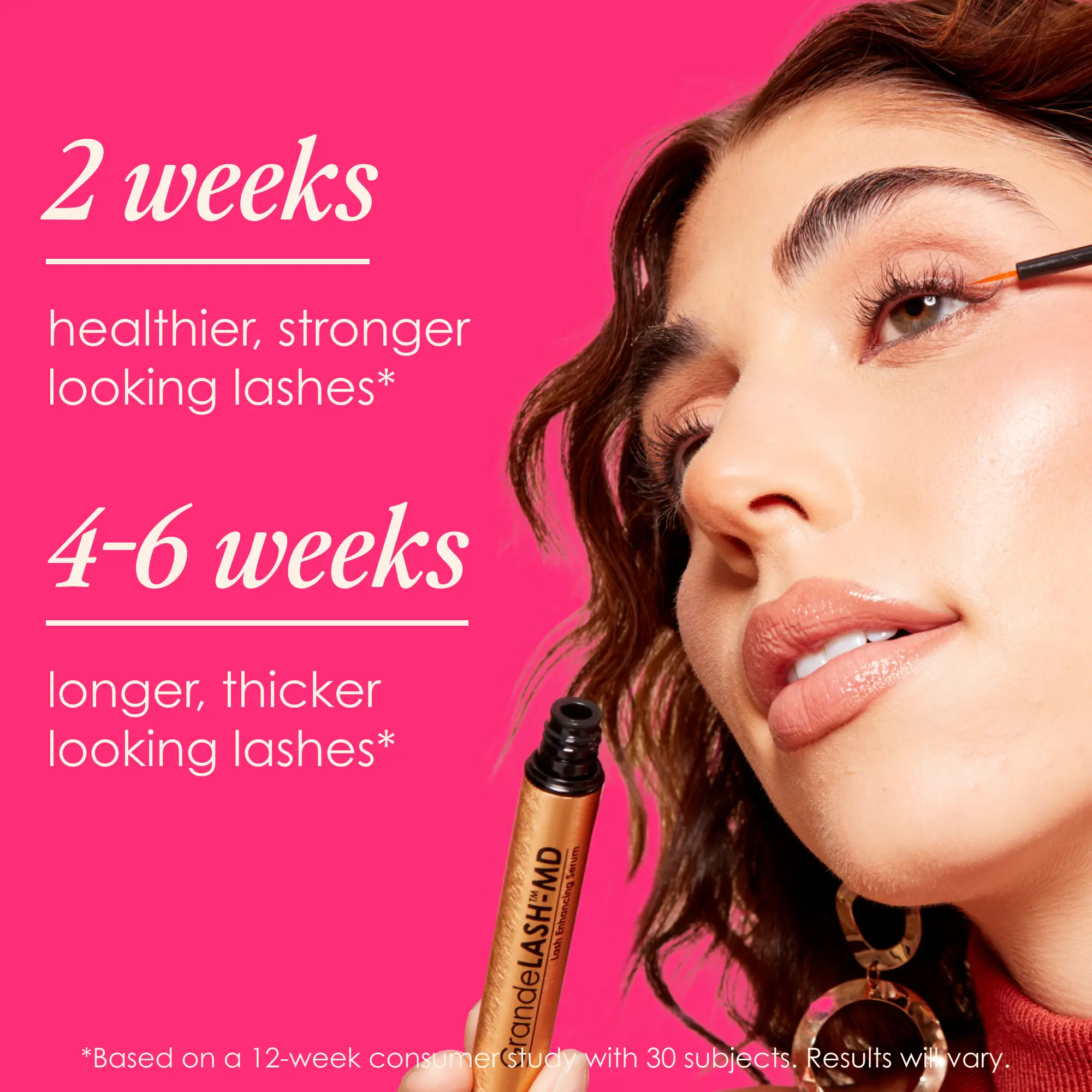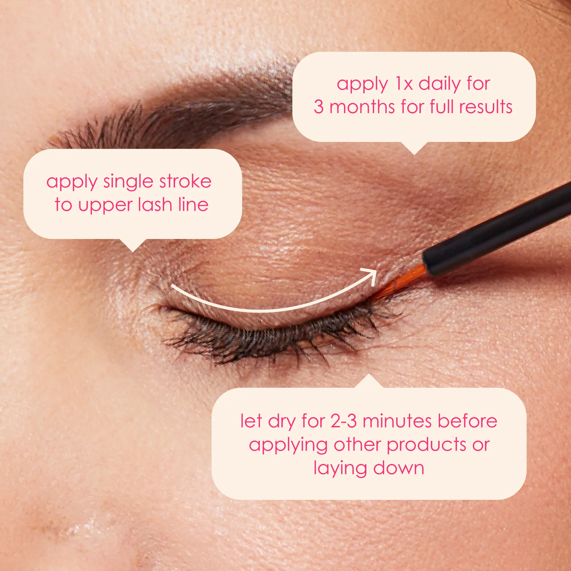 Directions: As with all cosmetic products used in the area of the eye (or close proximity to the eye), it is important to carefully read all directions and warnings. Carefully apply GrandeLASH-MD once daily on a clean, dry upper lash line only using a single stroke on your eyelid just above your upper lash line (like a liquid eyeliner). Do not apply to the lower lash line. Apply only with the product applicator provided. Use one dip into the bottle for both upper lash lines and allow 2-3 minutes for the serum to fully dry before lying down or applying other products to your eye area. Use sparingly. If serum gets into the eye, immediately rinse thoroughly with cool water to completely remove serum from the eye. Apply every day for a full 3 months. After desired improvement is achieved, apply every other day for maintenance. GrandeLASH-MD requires continued use to maintain benefits.