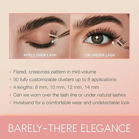 Flicked-out, flared strands for a natural yet noticeable enhancement. From the ever-popular Naked collection of lightweight, barely-there lashes, Ardell Naked Cluster 437 is a fully-customizable, 50-piece set of mid-volume lash clusters that allow you to create beautiful bespoke looks as individual as you. No one knows you like Naked. • Naked 437: flared, crisscross pattern in mid-volume