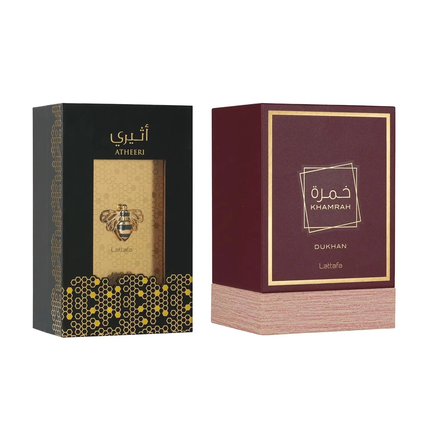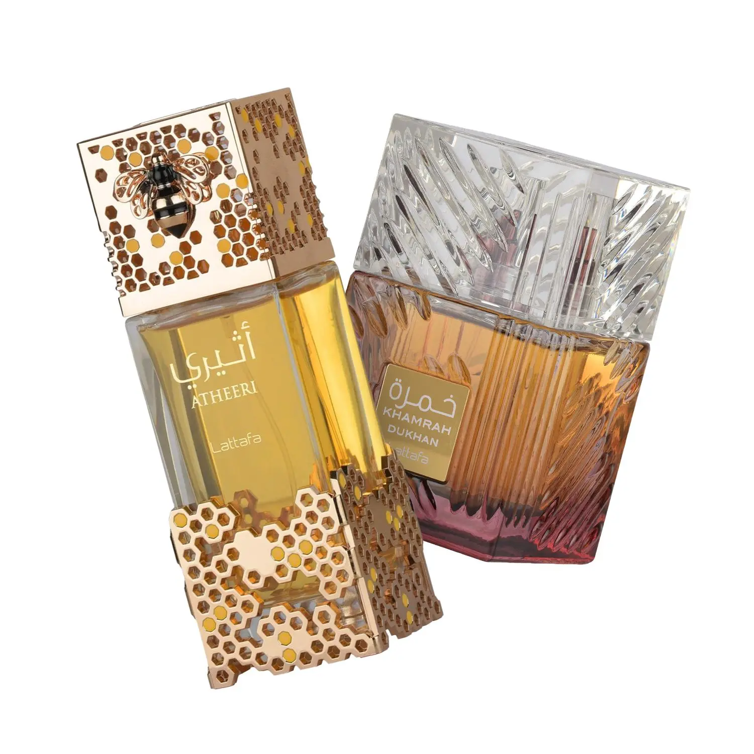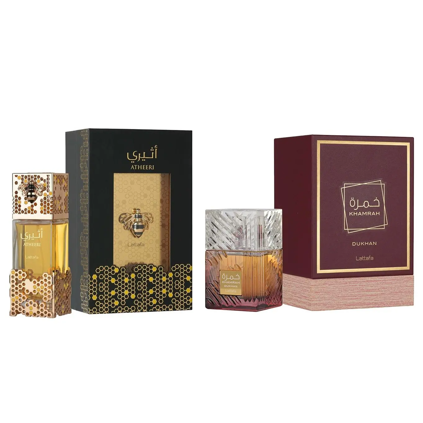 Discover the elegance of our Lattafa 2 Piece Bundle Set, featuring two exquisite Fragrance Atheeri Eau de Parfum Spray and Khamrah Dukhan Eau de Parfum Spray. Each bottle contains 3.4 Ounce of fragrance, providing a luxurious and long-lasting experience.