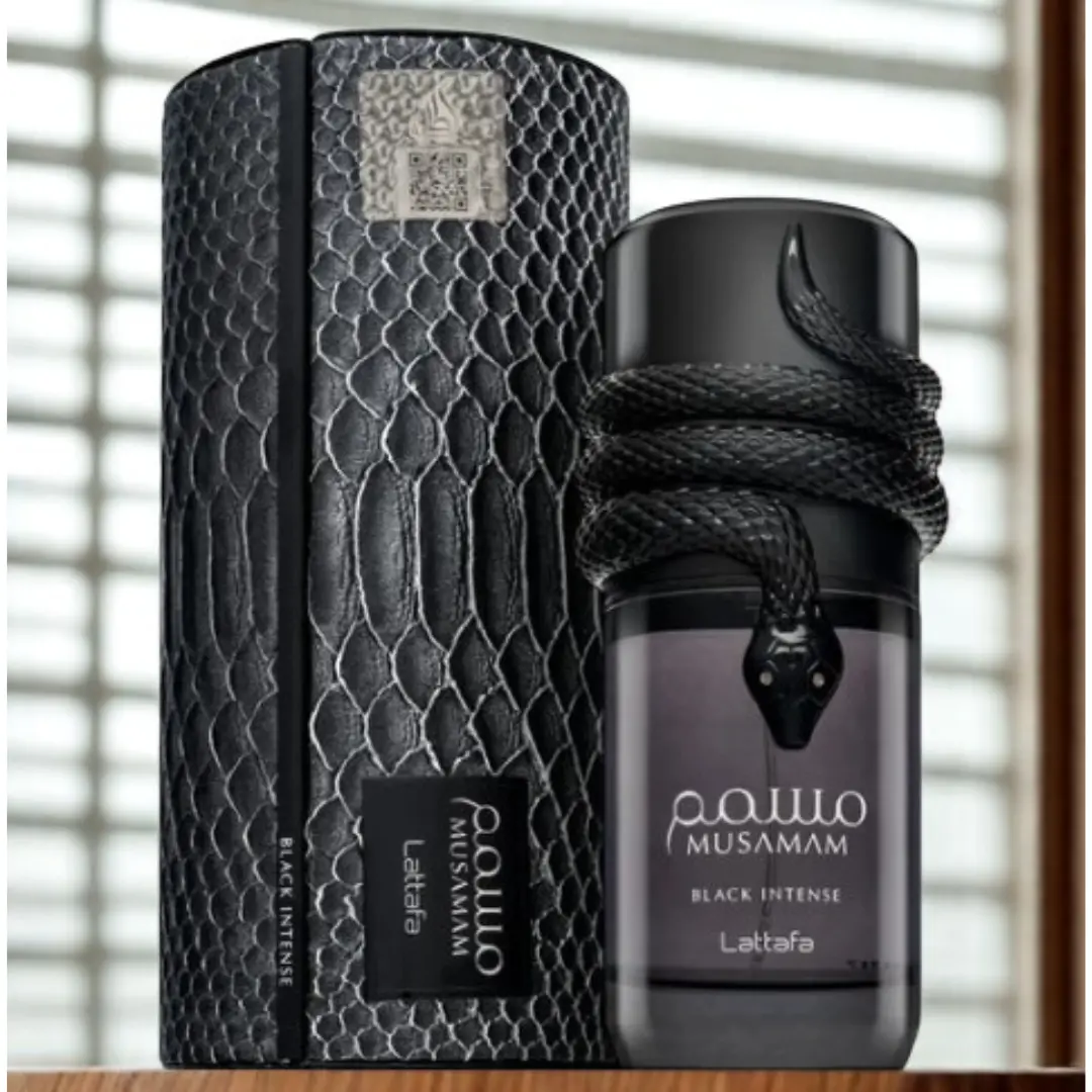 Musamam Black Intense hits with powerful spices, woods, amber, and smoky sweetness, creating a commanding, confident trail perfect for nights out and special occasions.