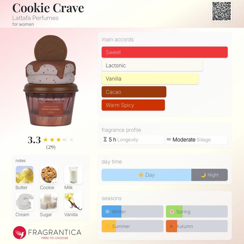 From Lattafaās Gourmand Collection, Cookie Crave is a sweet and comforting fragrance inspired by the irresistible aroma of freshly baked cookies. Blending cocoa butter, sugar, and creamy vanilla, this scent delivers warmth and indulgence with a refined edge. Perfect for daily wear, itās cozy yet sophisticated, making it an ideal gourmand signature.