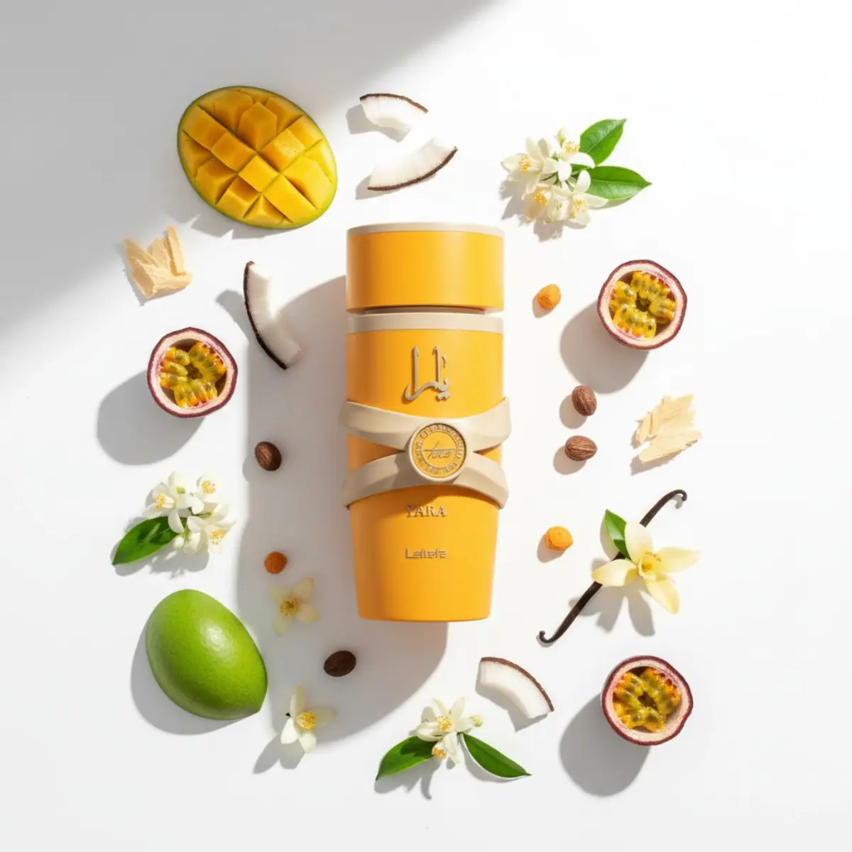 Top: Coconut, Mango, Passionfruit. Heart: Jasmine, Heliotrope, Orange Blossom. Base: Cashmeran, Vanilla, Musk. Discover the harmonious blend of Yara Tous in this set.