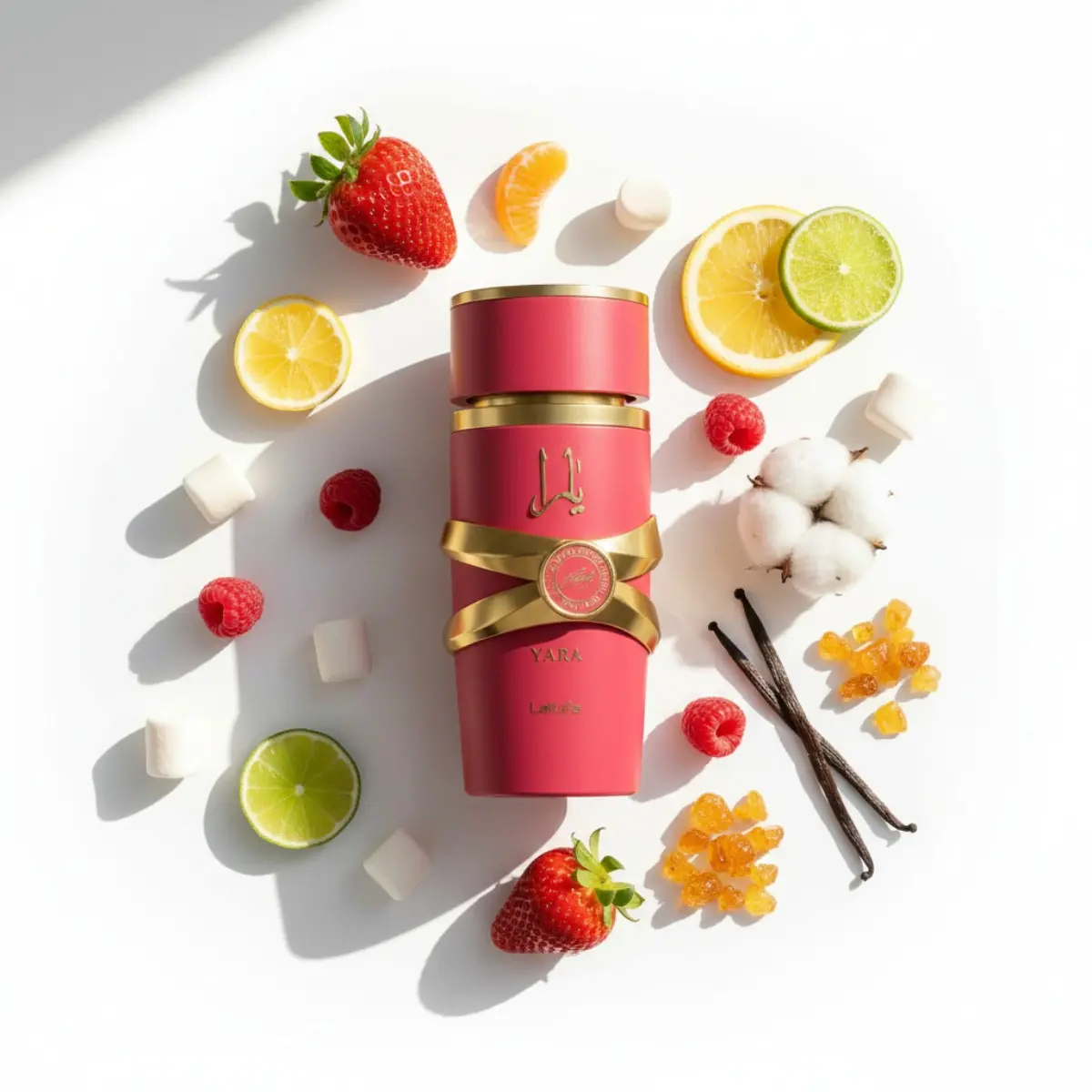 Top Notes: Green Mandarin, Blackcurrant. Middle Notes: Strawberry Fizz Candy, Gardenia. Base Notes: Sandalwood, Vanilla Syrup, Musk, Amber. Experience the essence of Yara Candy with these carefully selected notes.