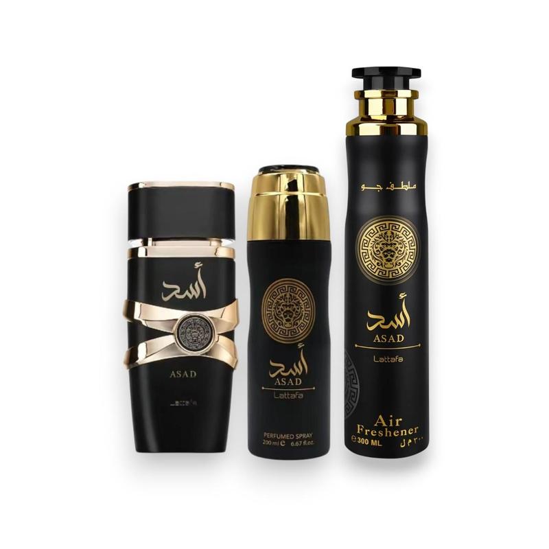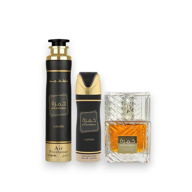 This set includes Khamrah, Air Freshener, Body Spray, and Asad products. Perfect for men, it offers a sweet, fresh spicy & amber scent. Ideal for those seeking a versatile fragrance experience. The bundle caters to various uses, from personal care to home freshness.