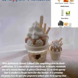 Warm butter pralines with salt. Pairs well with their Eclaire perfume. Has a sweet powdered caramel dry down. I highly recommend adding oil to make the scent last longer even though it last for 10+ hours and finding a similar scent to pair with it because you’ll be tempted to keep spraying it. ❤️