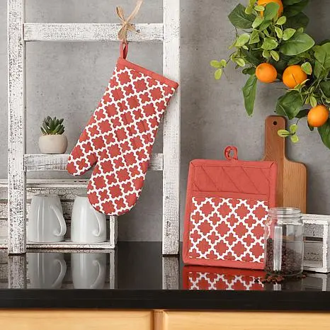 Design Imports Lattice Oven Mitt & Potholder Set The classic lattice pattern on these pieces is perfect in any kitchen. Each item is designed with a hanging loop for your convenience. Great gift for Christmas, Holidays, Mother's Day, Dinner Parties, Birthdays, Hostess gift, Housewarming and more.  What You Get Oven mitt (13" x 7") Potholder (9" x 8")