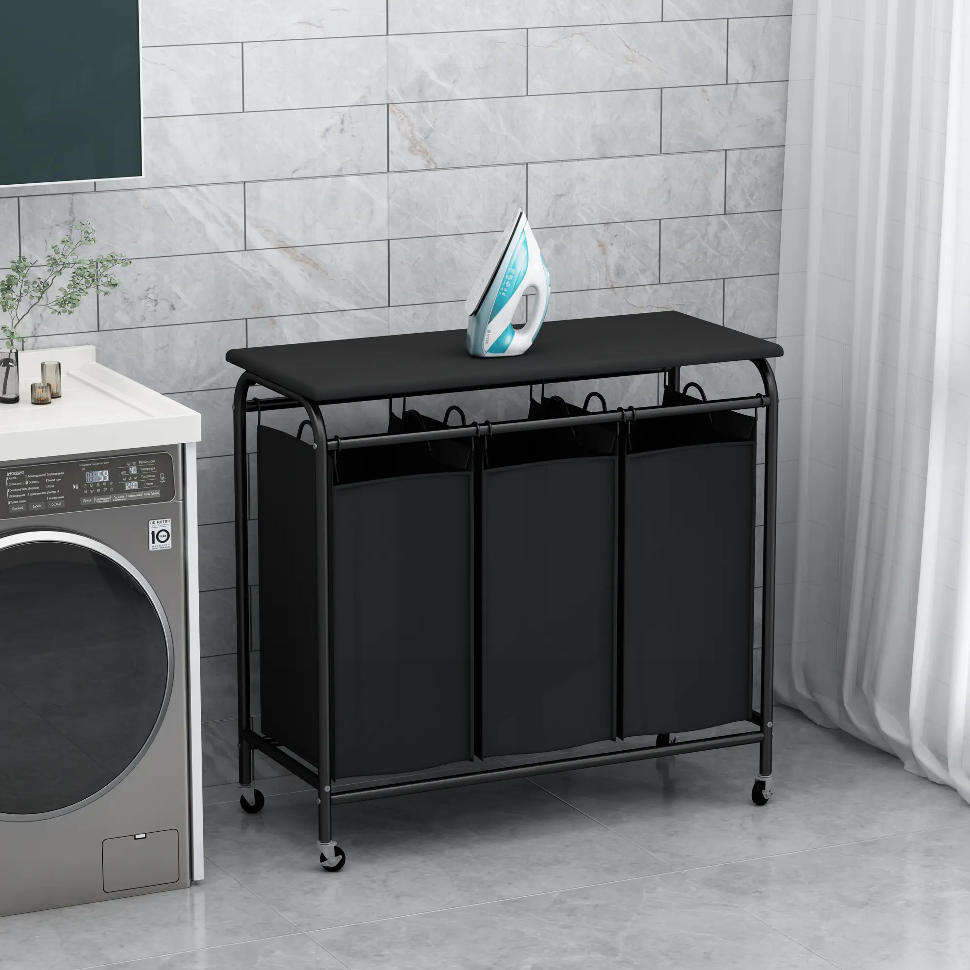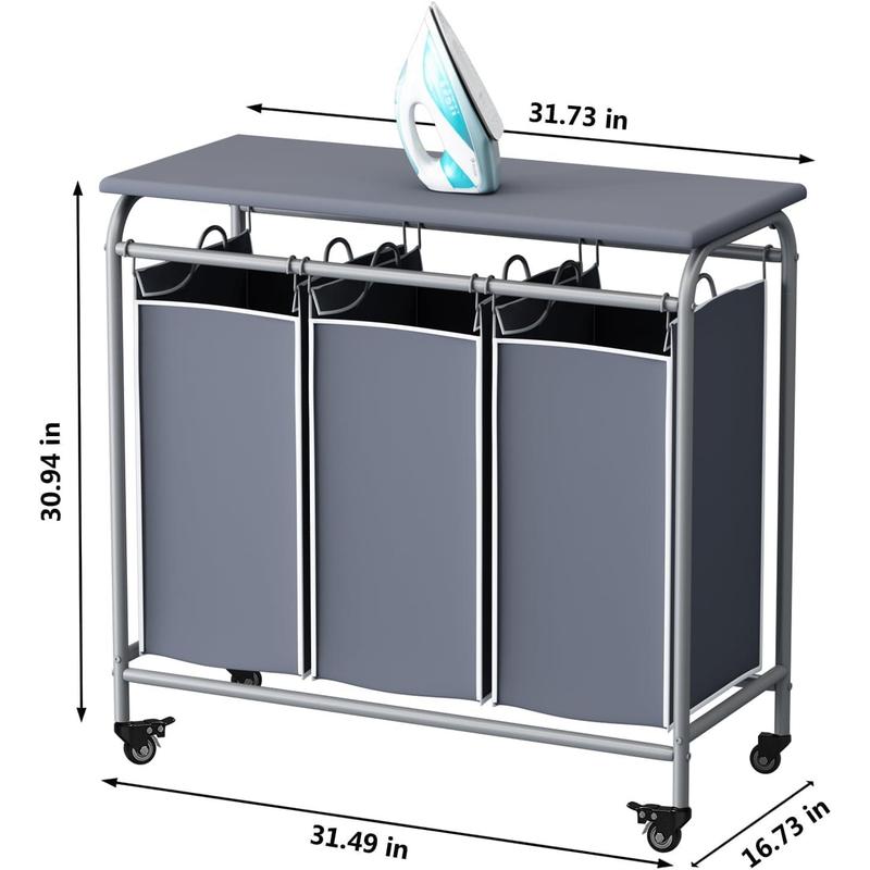3 Bag Laundry Basket Sorter Heavy Duty Rolling Lockable Wheels Laundry Hamper Cart with Ironing Board and Removable Bags Organiser Smooth Household Cover