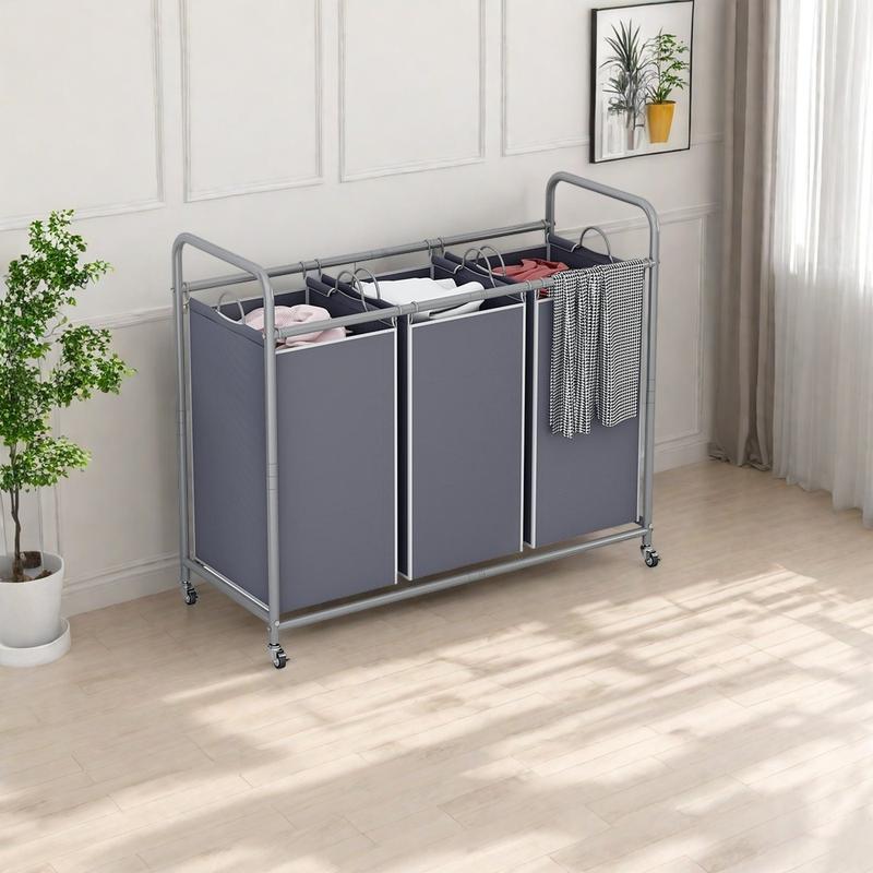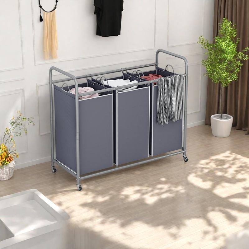 Measuring 32.68L x 15.75W x 33.46H inches, this cart holds three laundry bags, each sized at 9.44L x 12.6W x 22.04H inches. Its multi-grid design provides ample space for sorting dirty clothes, toys, or scattered items, keeping your home tidy and organized.
