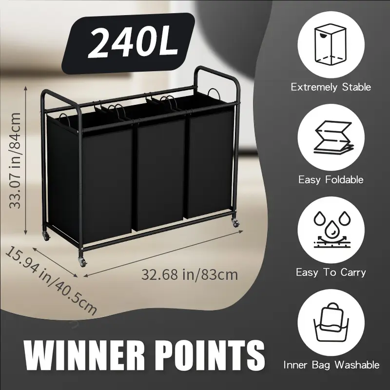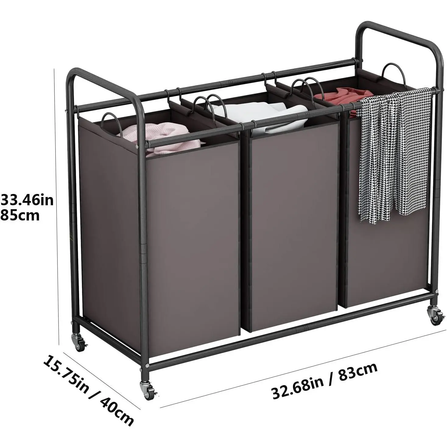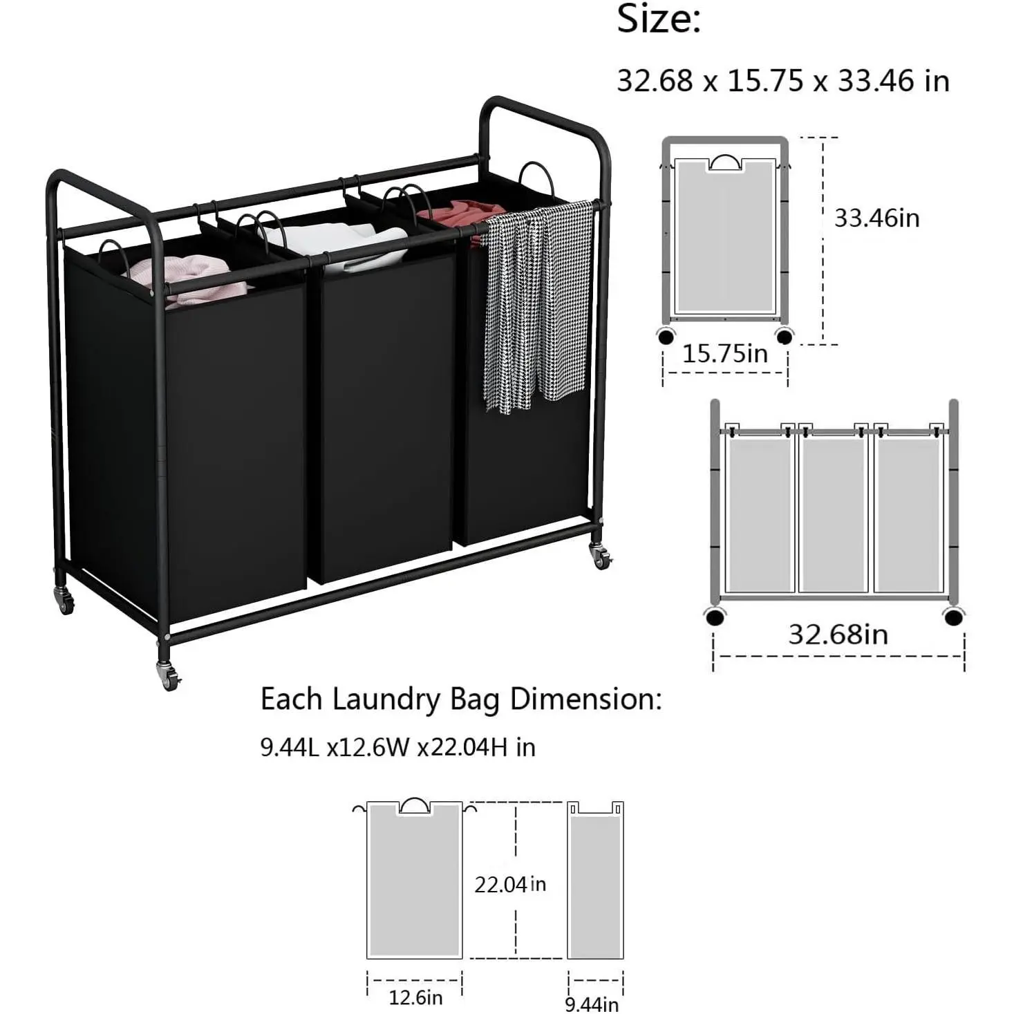 Measuring 32.68L x 15.75W x 33.46H inches, this cart holds three laundry bags, each sized at 9.44L x 12.6W x 22.04H inches. The multi-grid design provides ample space for sorting clothes, toys, or other items. Keep your home tidy and organized. 🧳