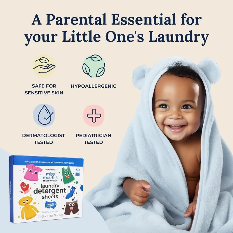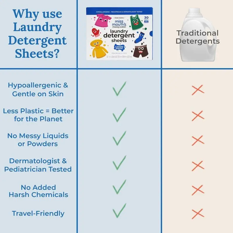 ·DITCH THE PODS, POWDERS, and LIQUIDS - Simply toss a sheet into your laundry for an effortless clean. Miss Mouth’s Messy Eater Laundry Detergent Sheets dissolve quickly, leaving your clothes fresh and clean, with no messy residue