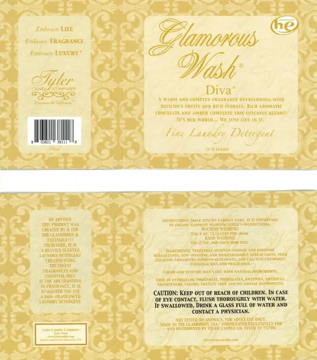 Give your clothes the glam treatment with the glamorous wash from Tyler Candle Company. This fine laundry detergent is designed to explore and expand the power of fragrance for an intimate glamour experience. Fine laundry detergent. Works for both machine washing and hand washing. Formulated to clean effectively yet remain gentle on delicate, specialty fabrics. Use on linens, lingerie, fine fabrics and more for a long lasting, soothing aroma of the diva fragrance.