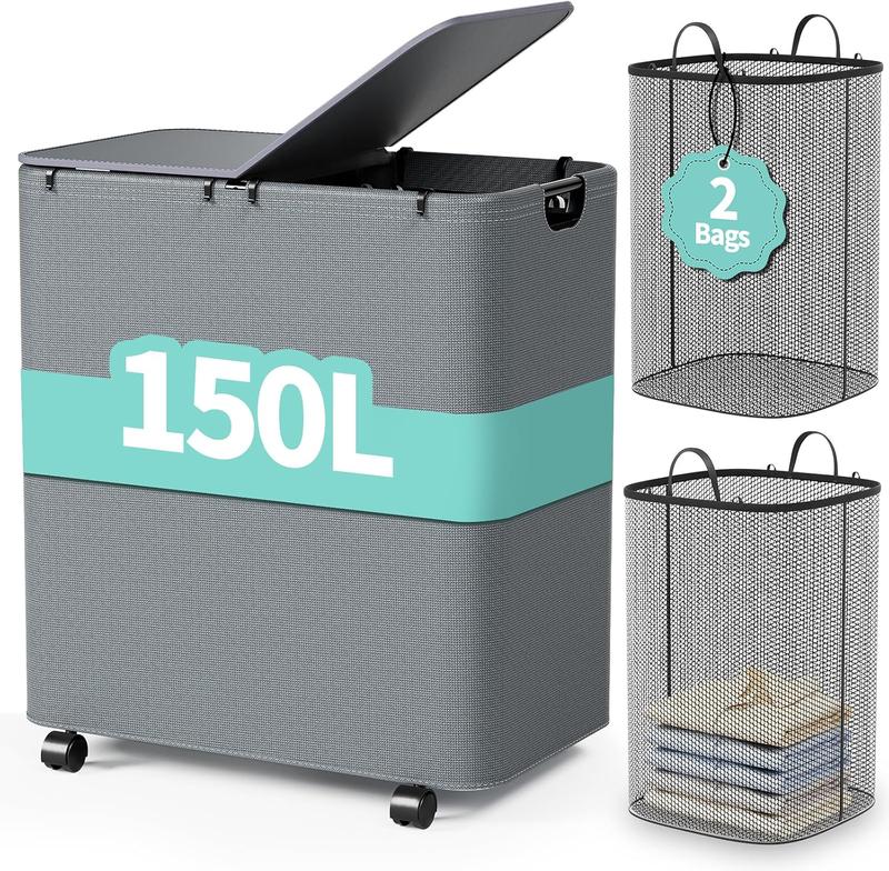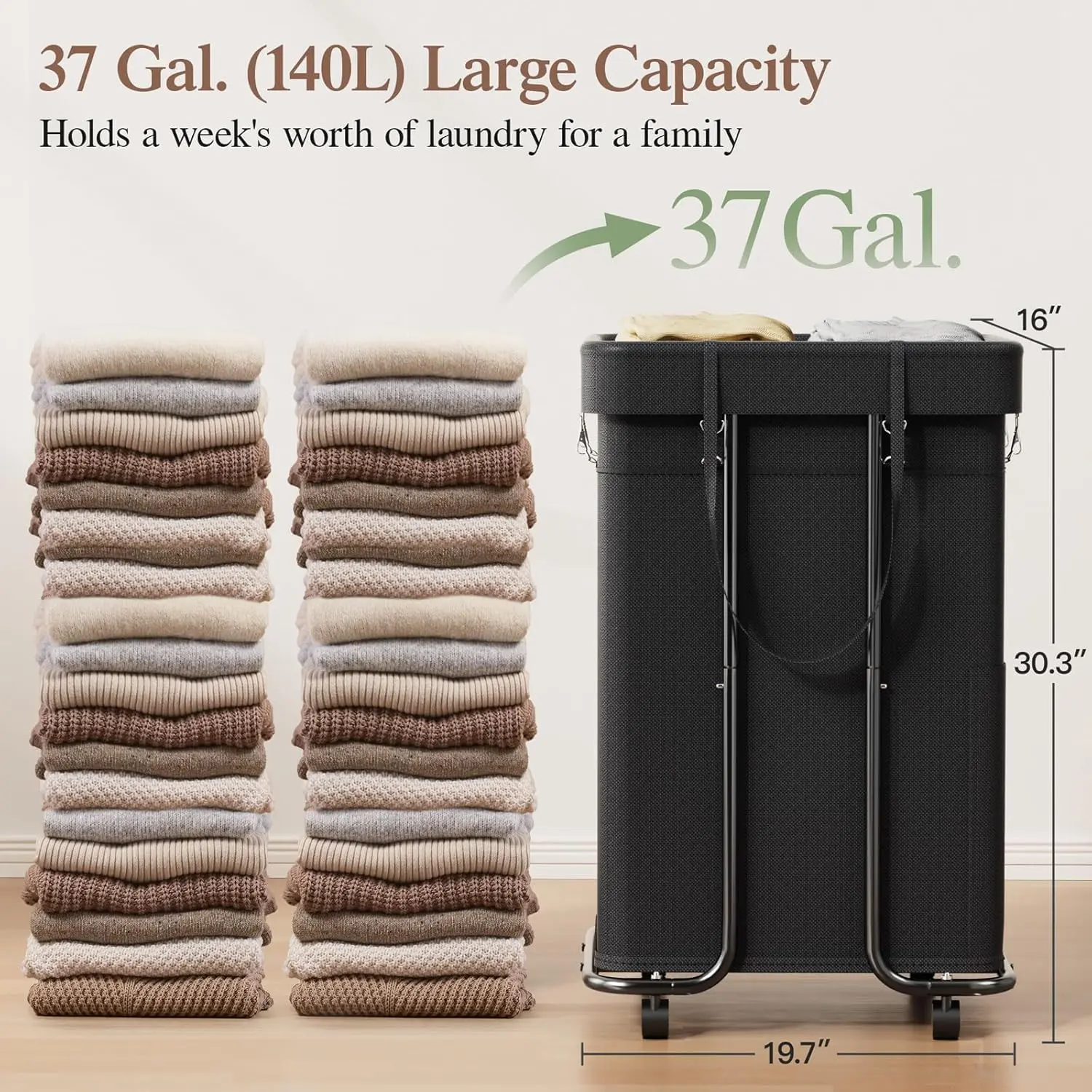 ·Big Capacity, All In One: rolling laundry hamper standing size 24.6"L×14.6"W×27.8"H, boasts a 140L super capacity, perfect for accommodating large family loads. Whether bulky winter coats or everyday garments, our large laundry basket handles them all effortlessly, helping you stay organized