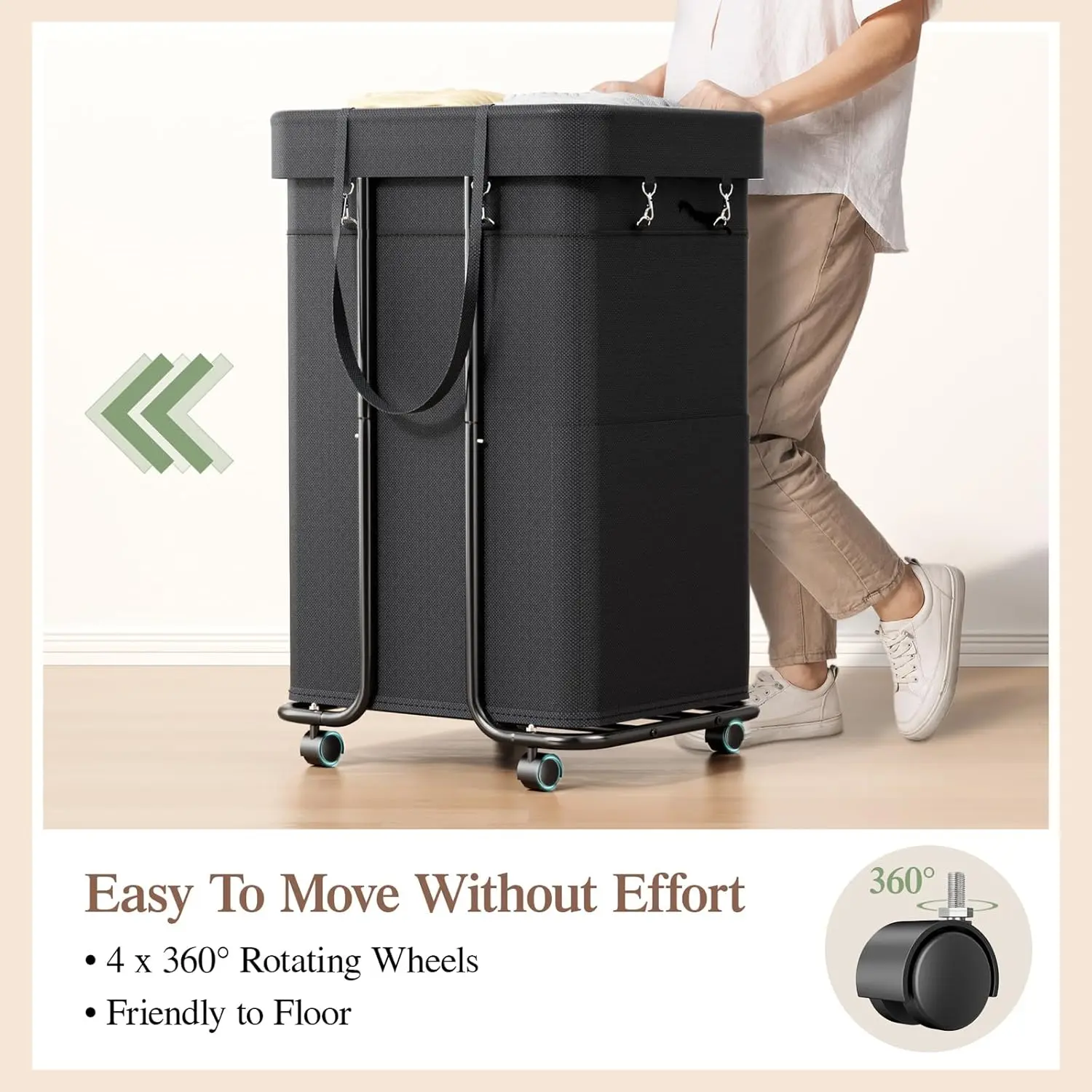 ·Easy Glide, Anytime Anywhere: With Four flexible 360° swivel wheels, our clothes basket laundry moves effortlessly between rooms. From the bedroom to the laundry room, there’s no more heavy lifting; just a simple push saves you time and effort