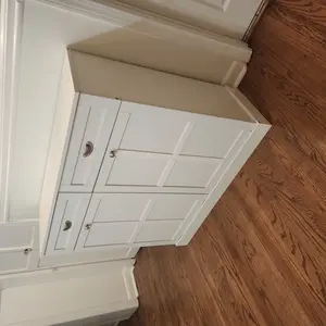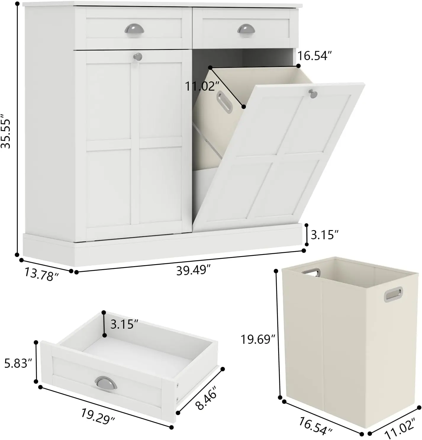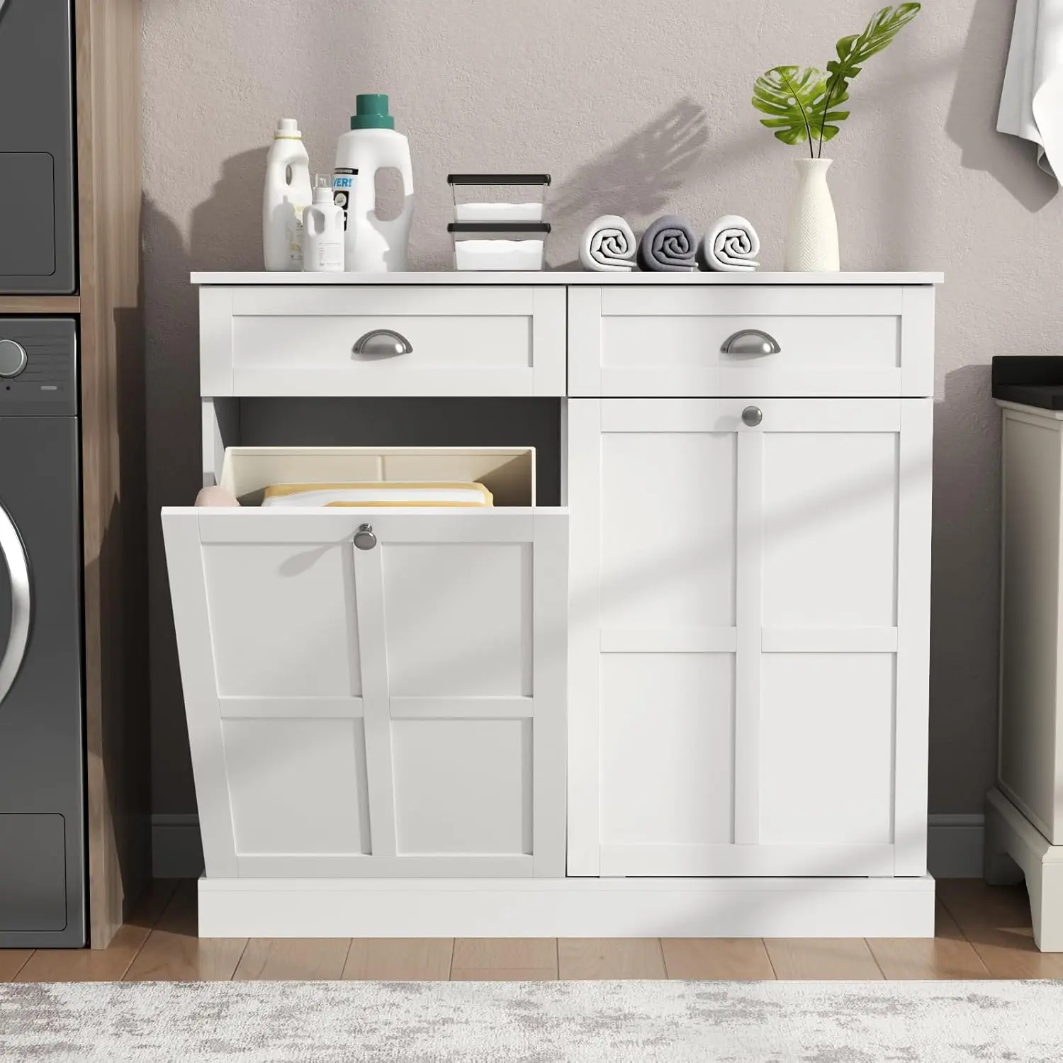 Sturdy & Stable Construction: Featuring premium MDF and sturdy metal hinges, this tilt out laundry cabinet provides excellent stability and solid support to ensure long-lasting use. The top can hold up to 110 lbs. The top 2 drawers come with guide rails that glide with ease, making it easy to open and close. This laundry cabinet has an elevated base to ensure your items stay dry even when there is water on the floor. It also comes with an anti-tilt kit that you can mount on the wall for added stability.