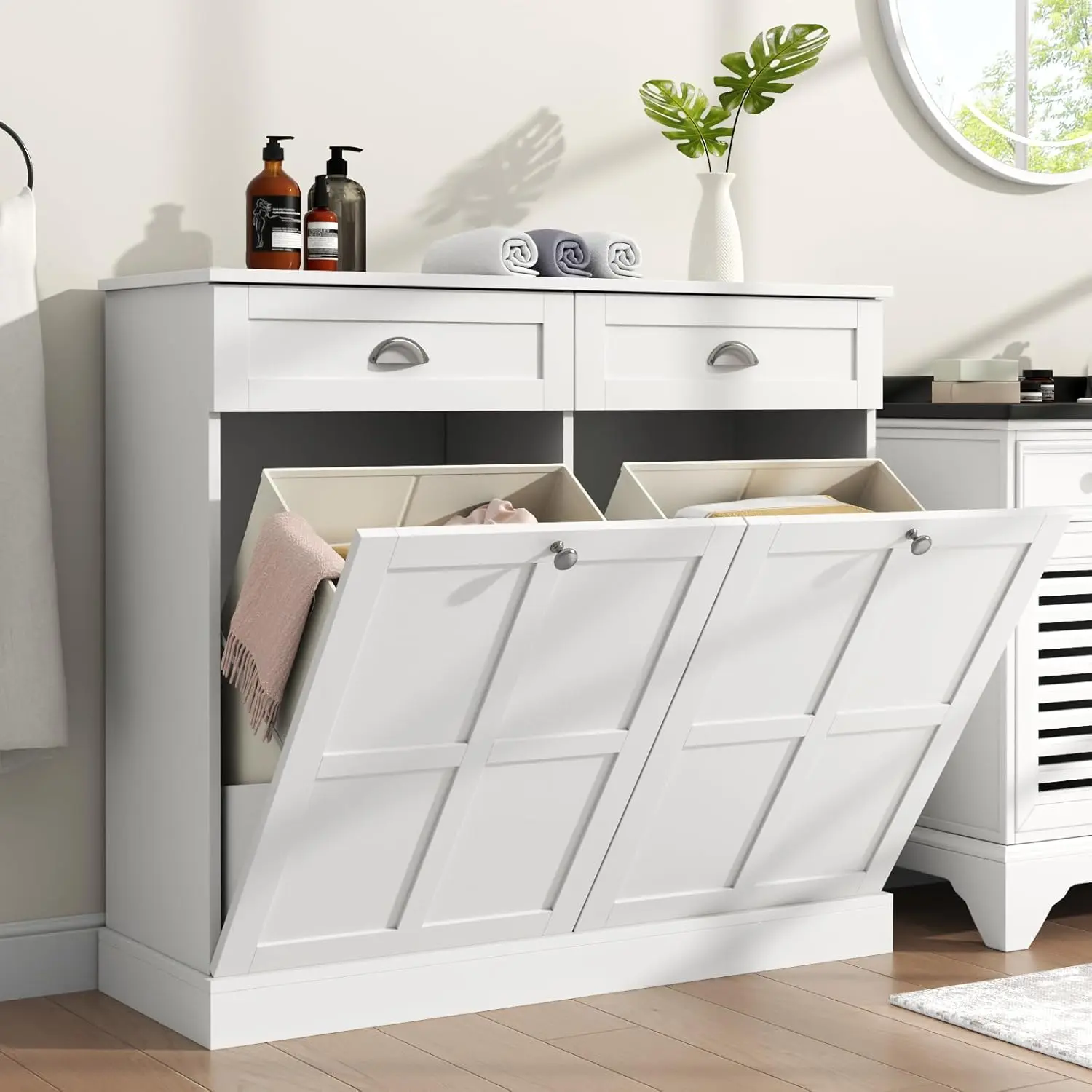 Push-Pull & Hidden Laundry Cabinet: Elevate your bathroom with this functional laundry cabinet. This laundry cabinet has a hidden design with two pull-out and removable baskets. You can put dirty clothes in and hide them, and remove baskets anytime to carry them to the laundry room for cleaning. This laundry hamper cabinet effectively isolates dirty clothes and odors for a cleaner and more sophisticated space. This is a classic piece that disguises your laundry.