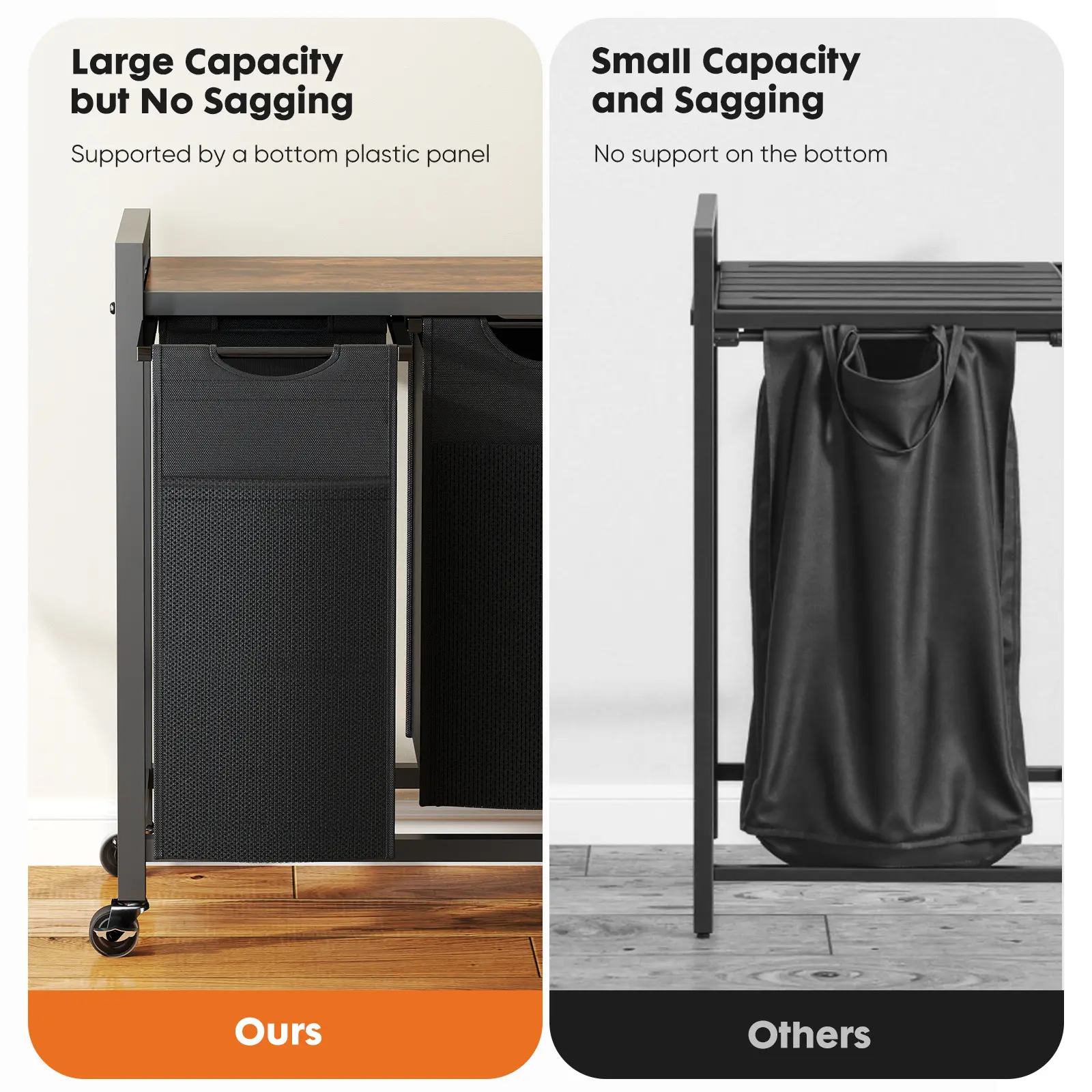 ·【Pull-Out, Removable Bags for Easy Carrying】No need to move the entire basket! The pull-out design lets you slide out each bag effortlessly, while sturdy side handles make it simple to carry clothes to the washer. The bags feature reinforced bottoms to prevent sagging—even when full—and are fully washable for lasting freshness.