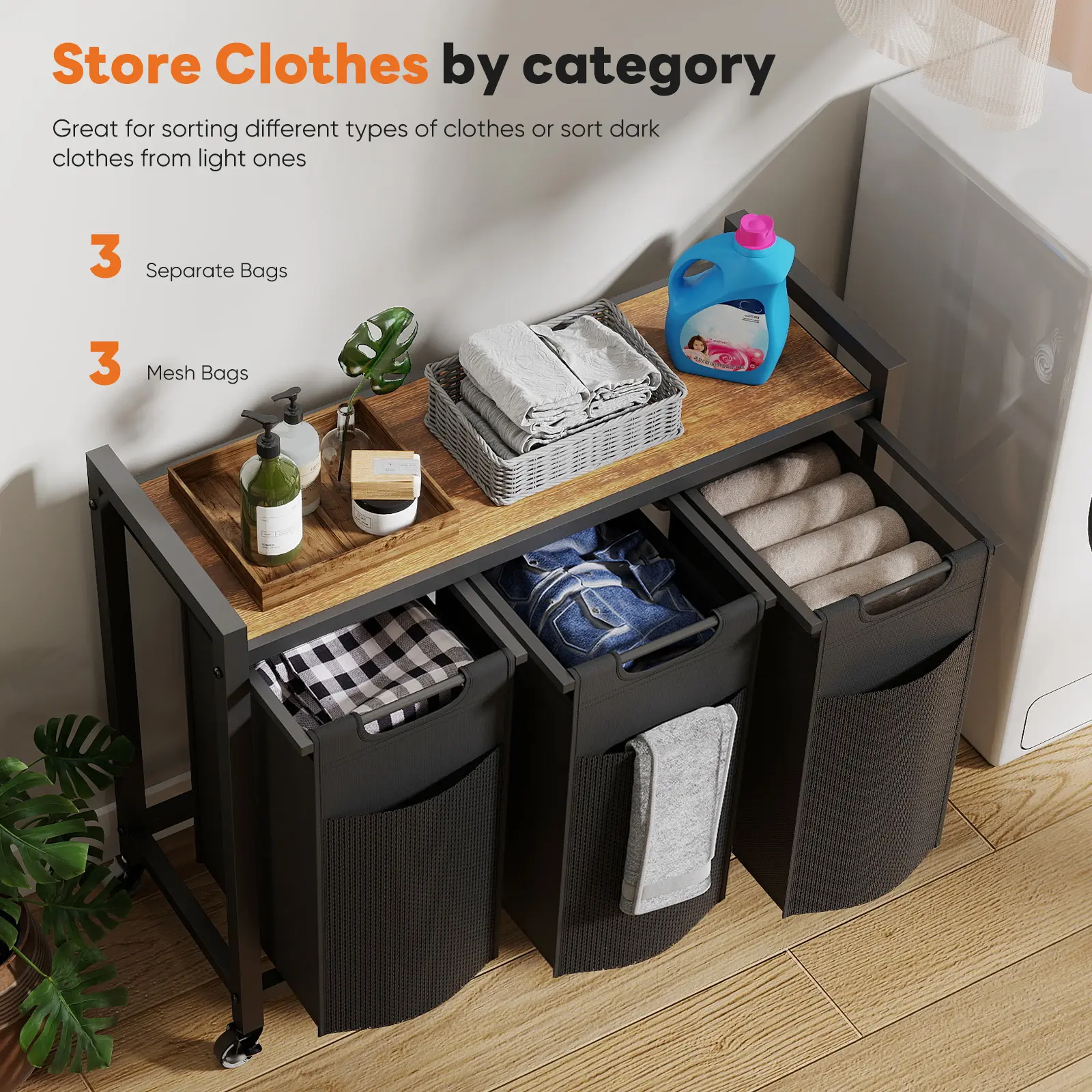 ·【Built to Last with Quality Materials】Made from premium particleboard, a reinforced iron frame, and durable Oxford fabric, this laundry sorter is built for long-term use. Two lockable wheels make it easy to move or secure in place, and four adjustable feet ensure stability on uneven floors.