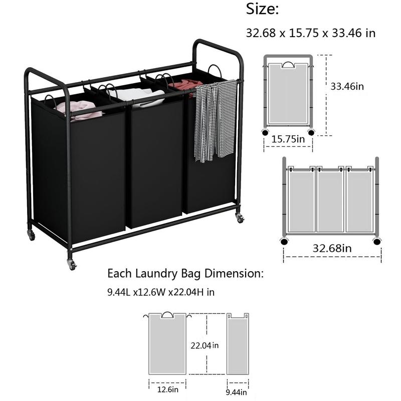 ·Large Capacity :Frame dimension of 3 bags laundry basket sorter cart :32.68L x 15.75W x 33.46H inches, each laundry bag dimension:9.44L x12.6W x22.04H inches. Multi grid design providing large container to sort dirty clothes and toys or other scattered items,make you home clean and neat.