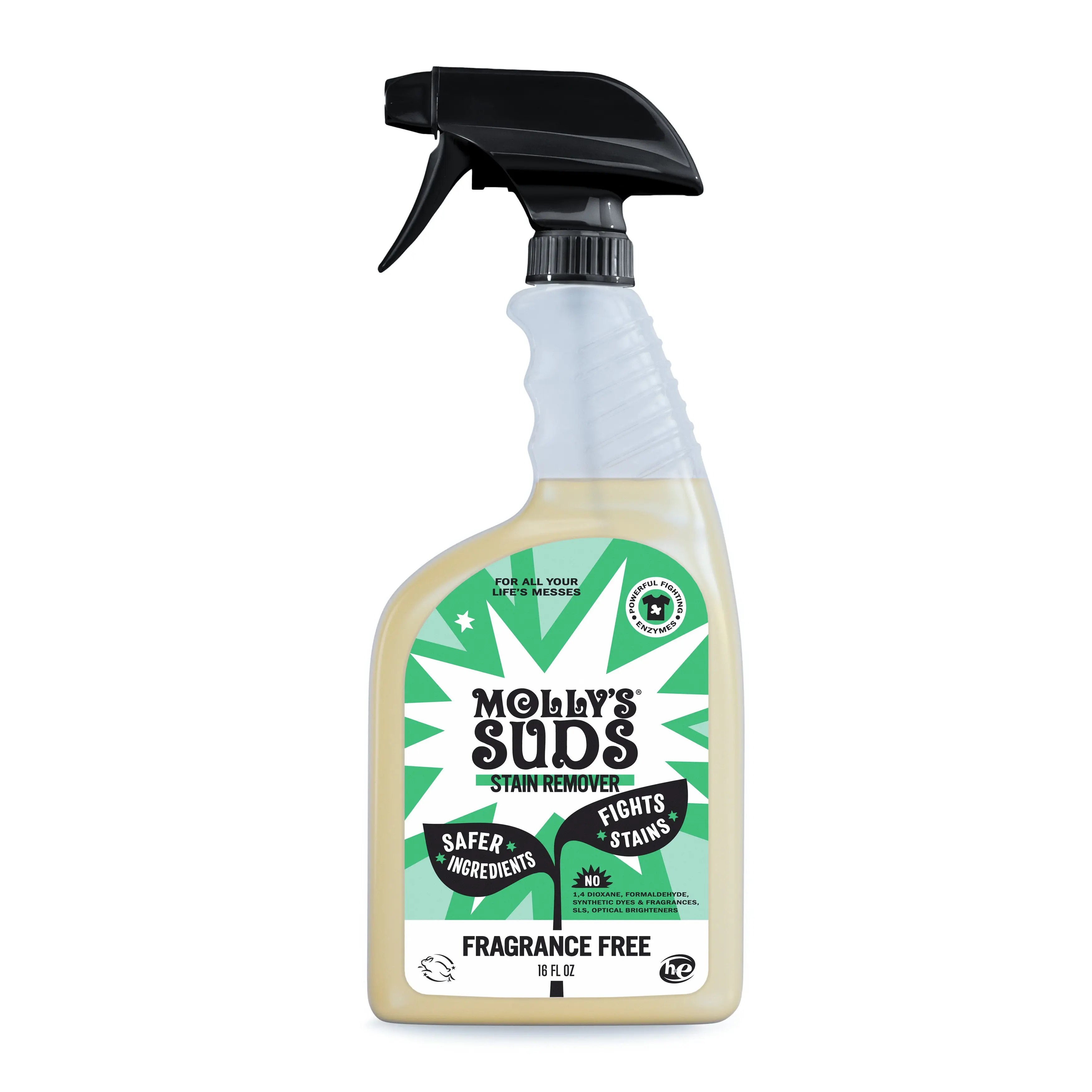 Molly’s Suds Stain Remover Spray does not contain: Harmful Fragrances, Dyes, Cancer-Causing Contaminants like Formaldehyde & 1,4-Dioxane, Volatile Organic Compounds (VOCs), Optical Brighteners, Synthetic Nonylphenol Ethoxylates, Petrochemicals, Phosphates, Chlorine, Sodium Laureth Sulfate (SLES), Phthalates, Parabens, Methylisothiazolinone, Cocamide DEA