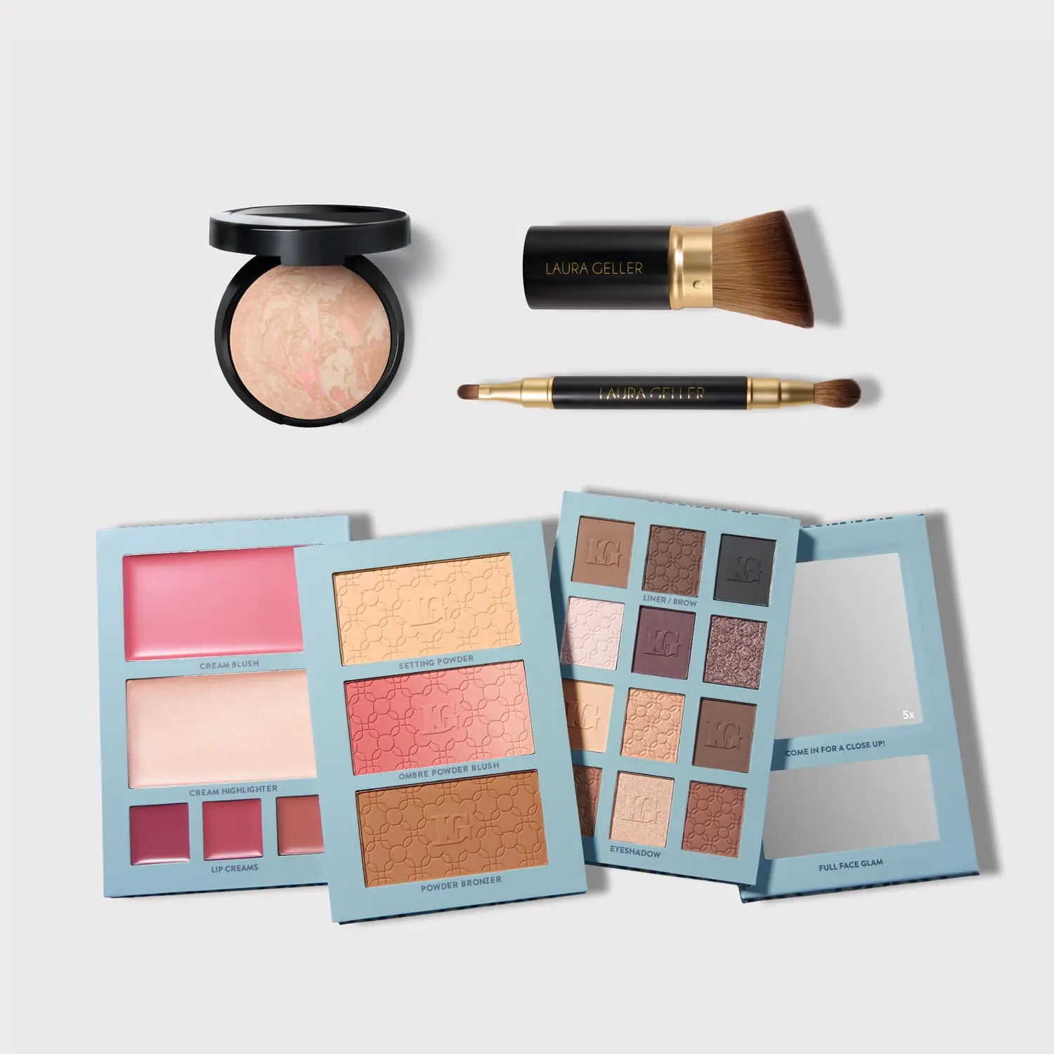 ·Includes a foundation, two versatile brushes, and eyeshadows, versatile eye and brow liners, bronzer, setting powder, blushes, a cream highlighter, cream lip colors, a full face mirror, and a magnifying mirror in the palette!