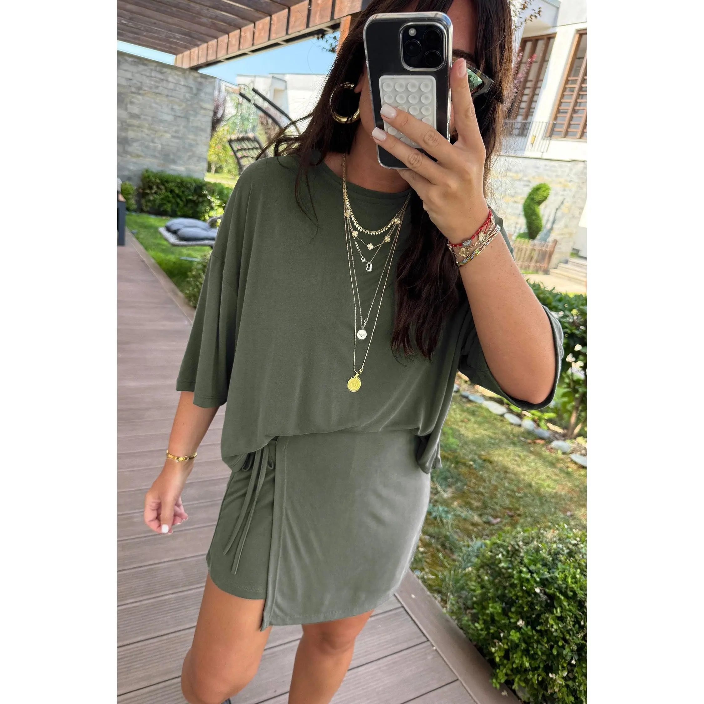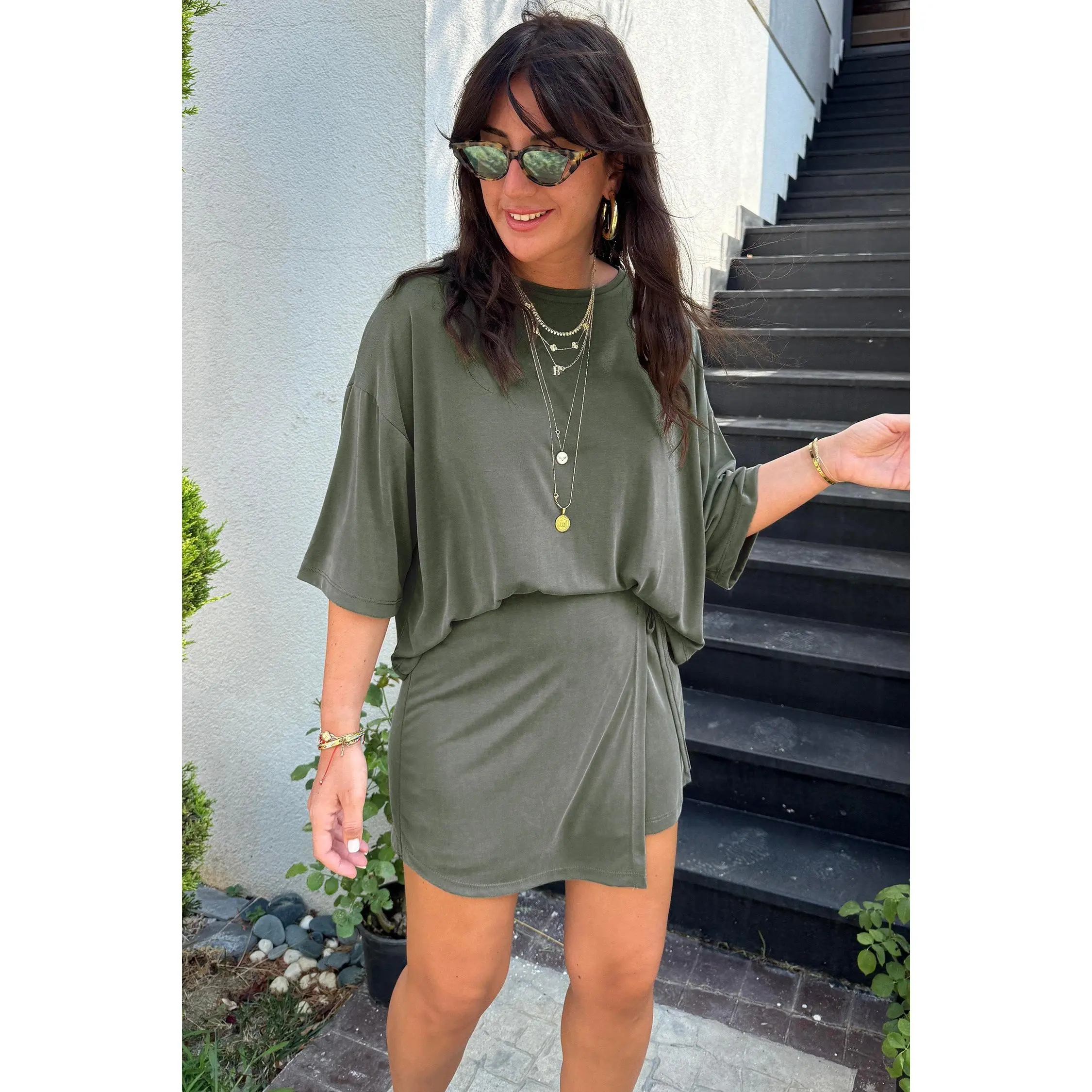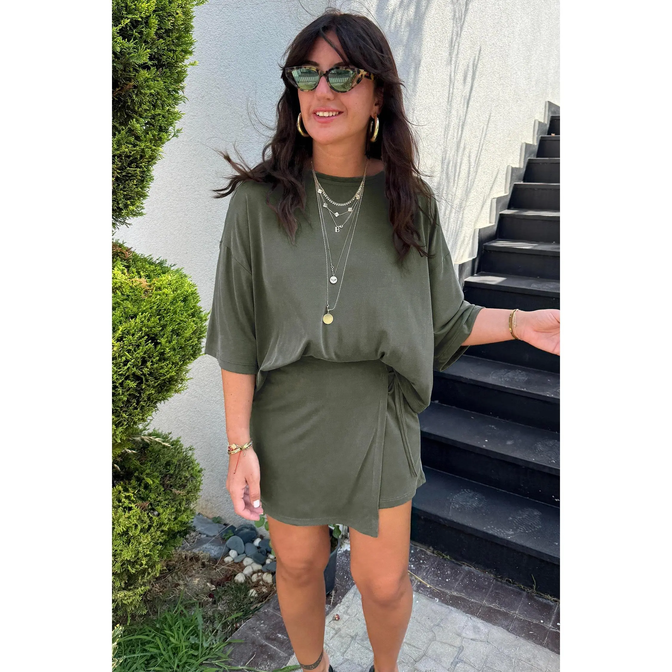 Laurel Green Solid Color Oversize Tee Tie Wrap Mini Skort 2pcs Set