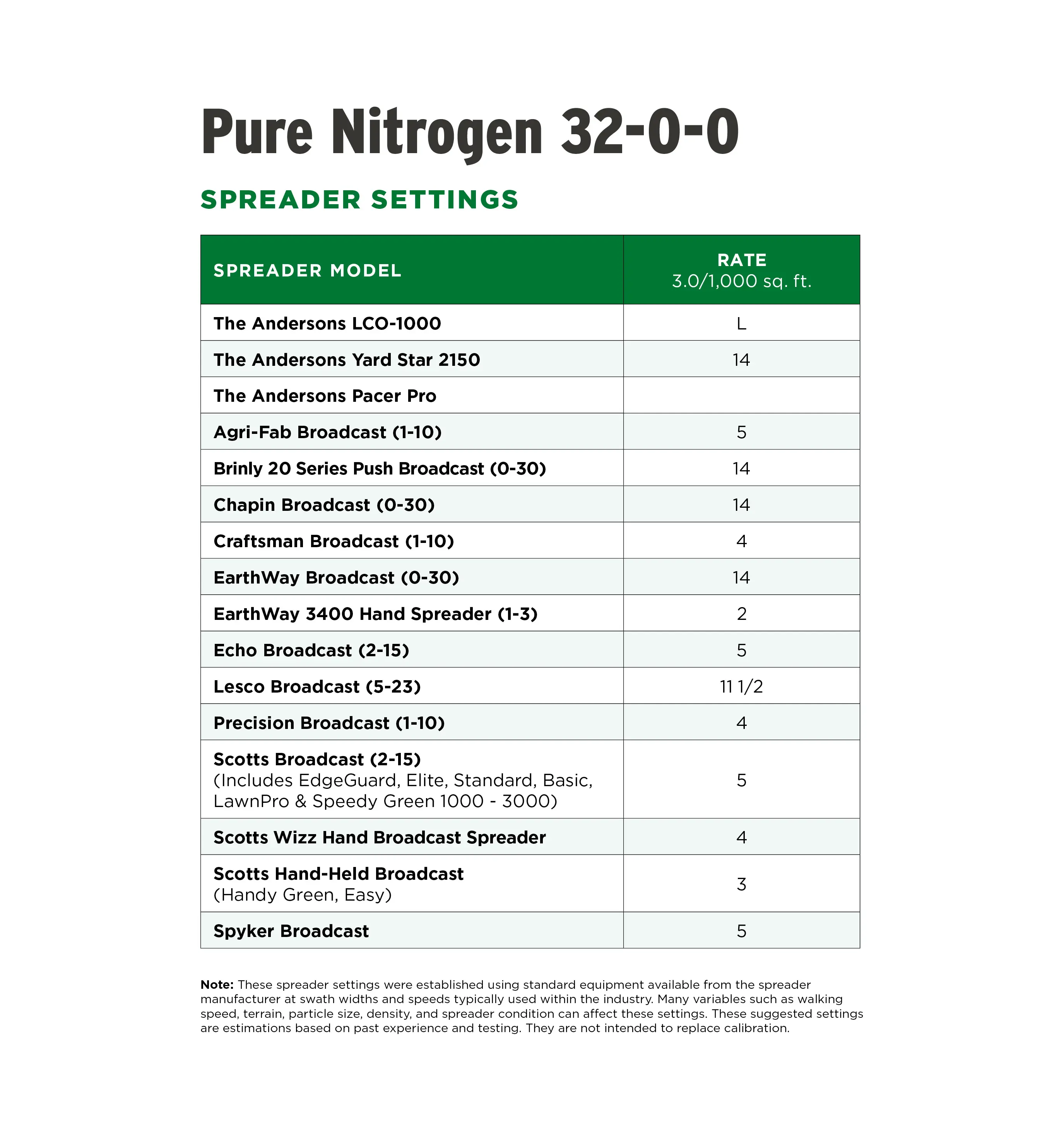 - Fill and adjust your spreader to the recommended rate using the spreader settings table.