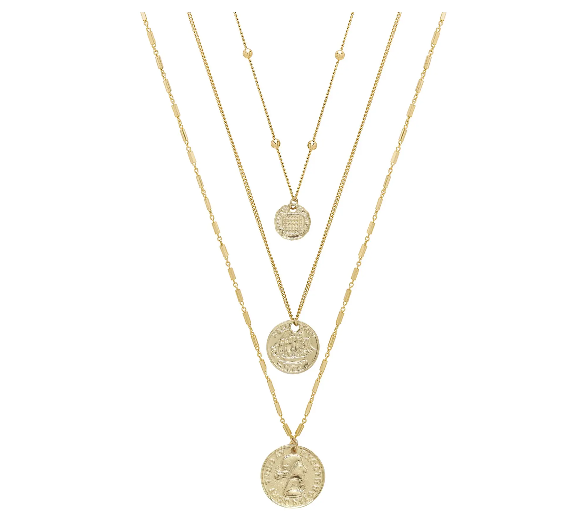 Elevate your style with this necklace set featuring a trio of elegantly designed chains in goldtone finish, each adorned with its own unique goldtone coin. This versatile set allows for an array of styling options, whether worn layered together or individually, making it a perfect addition to any outfit. From Ettika.