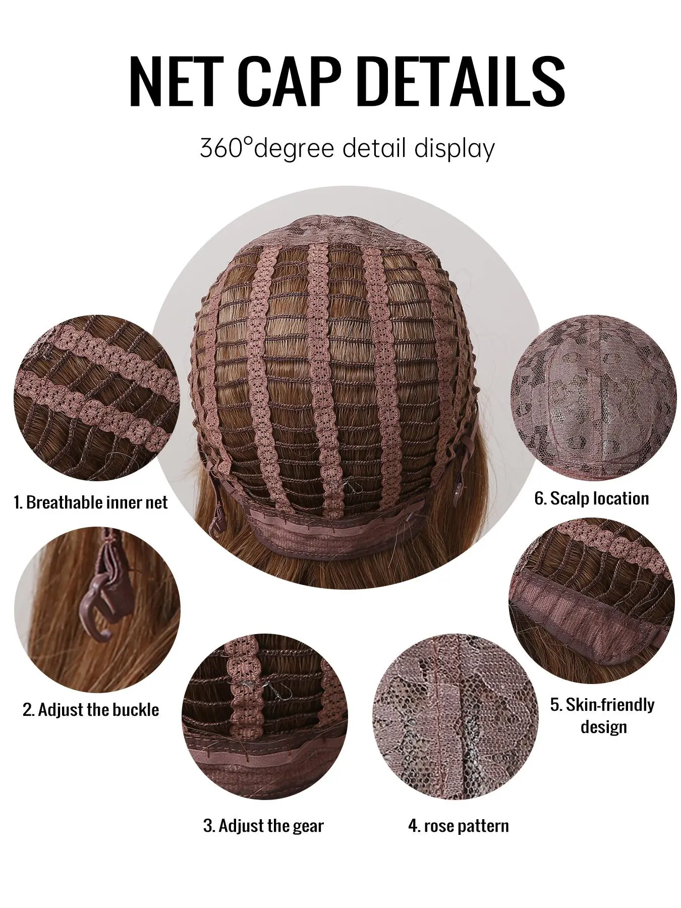 Very beautiful coloring, very curly, medium density, hard top design, no clips only adjustable straps. Cap feels large. I'm an average size normally.