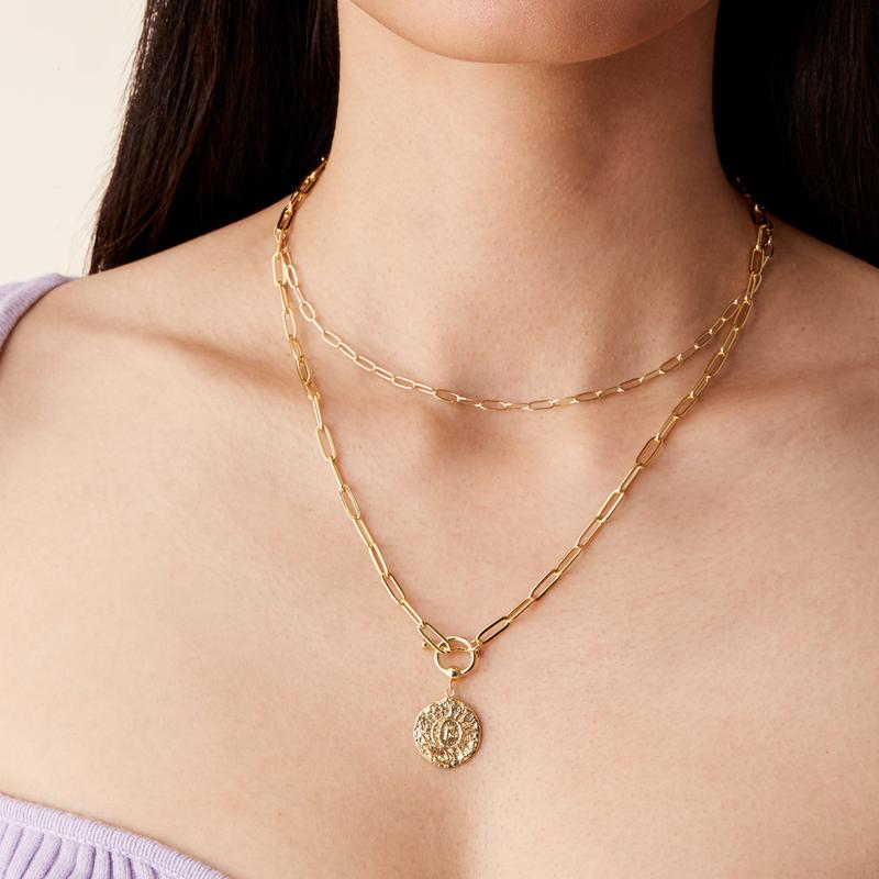 The piece was supposed to be a layering necklace called Sun and lock, However, the necklace was incomplete, the box was delivered crushed & damaged. Quality control was very disappointing & not trustworthy. So frustrating to have to start a refund and take pictures In the middle of opening Packages.