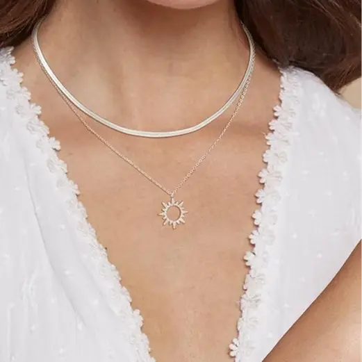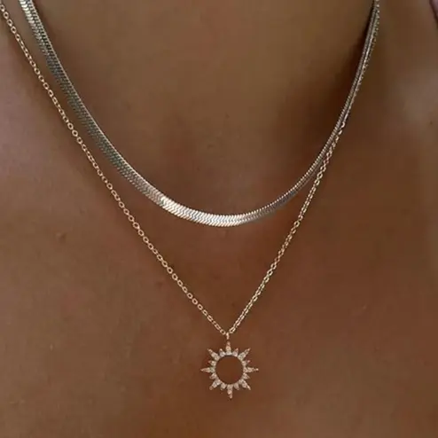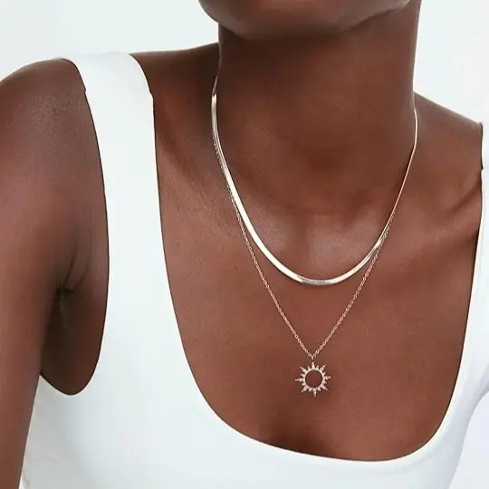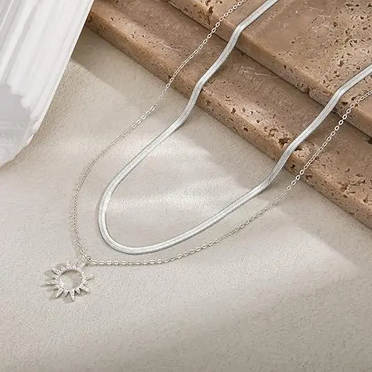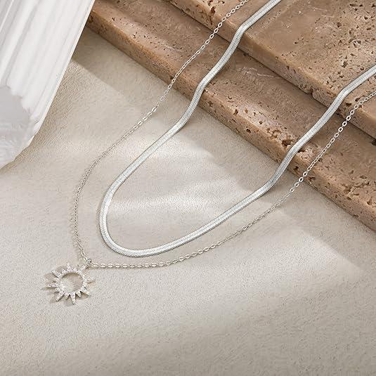 Discover the Tewiky 14K Gold/Silver Plated Adjustable Length Necklace. This Moodear gold layered necklace showcases a dainty herringbone chain and a 14K gold snake chain. The gold-plated sun zirconia pendant adds a touch of luxury. Perfect for women who appreciate subtle elegance. Crafted from brass, it’s tarnish-resistant, nickel-free, and hypoallergenic. Ideal for everyday wear.