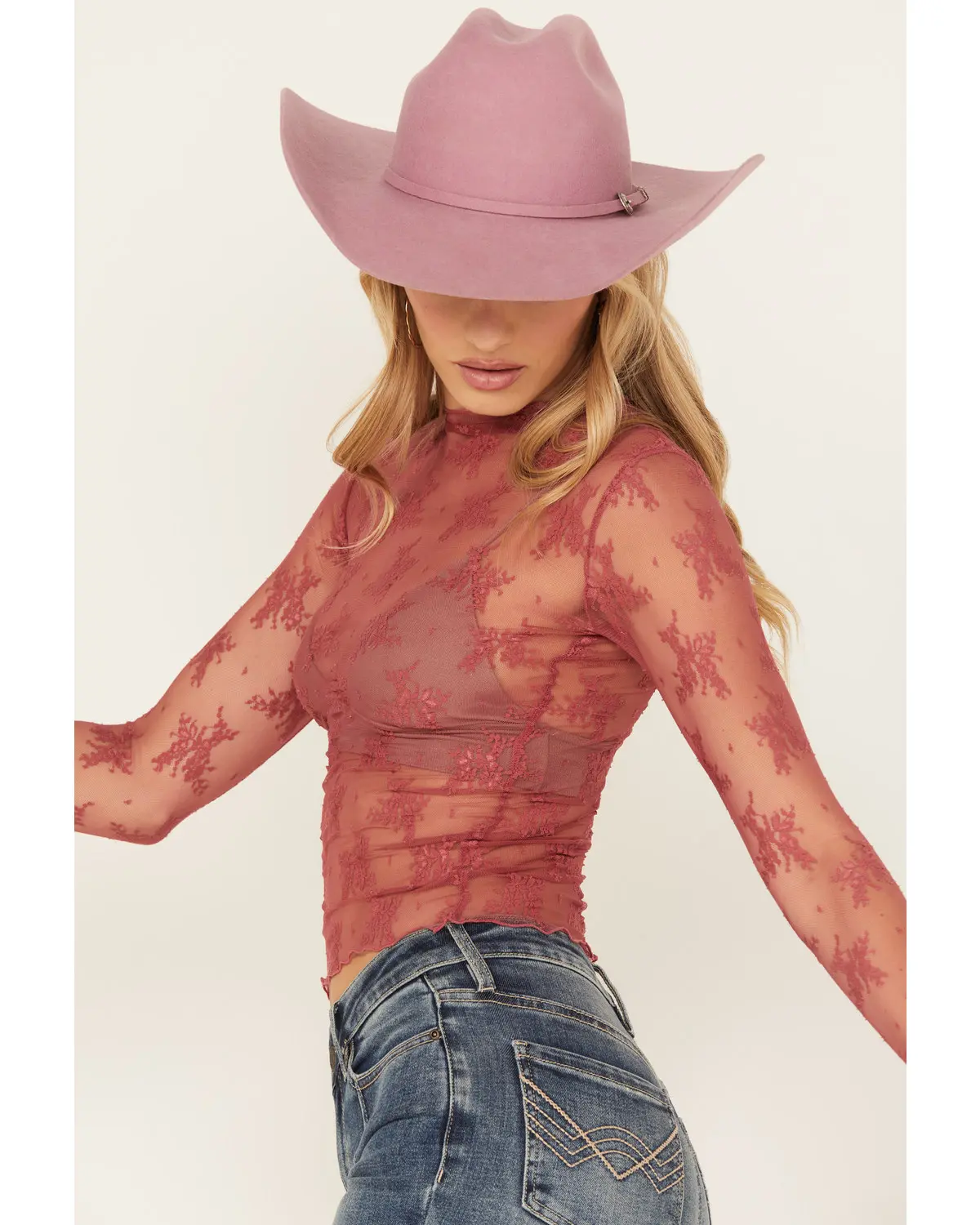 85% Nylon / 15% Elastane. Mock neckline. Long sleeves. Fitted. Full floral lace design. Sheer design. Solid rose pink design. Hand wash, lay flat to dry. Imported. Model is 5'9 1/2 wearing a size XS.