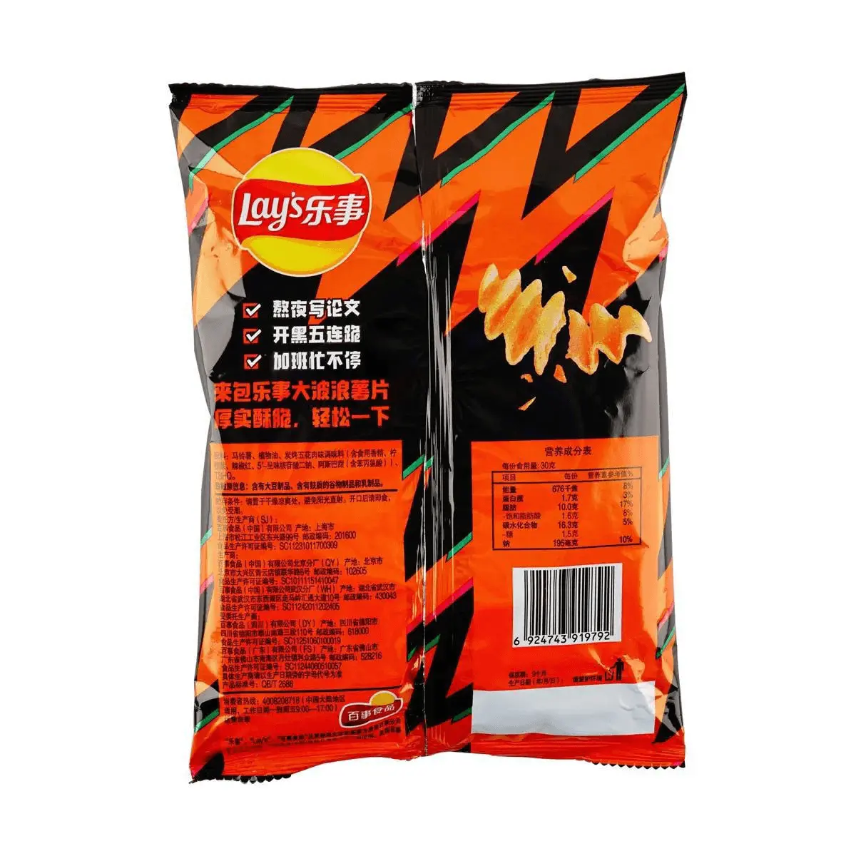 🌊 Experience the satisfying crunch of our signature wavy cut, perfectly seasoned with a savory and smoky BBQ pork flavor that's a hit in China. Each 70g bag is packed with deliciousness, making it the perfect snack for any time of day.
