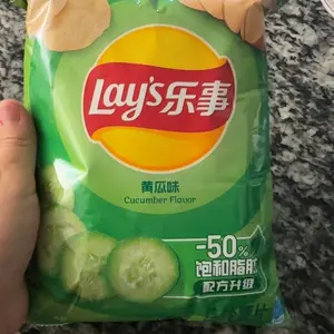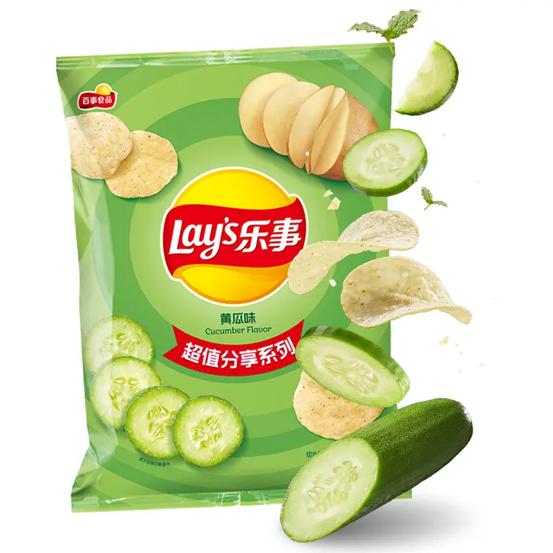 Ingredients: Potato, Palm Oil, Cucumber Flavour Seasoning (Sugar, Maltodextrin, Salt, MSG, Flavouring, Amaranth Powder, Onion Powder, Vinegar Powder, Anticaking Agent (E551), Cucumber Powder, Sweetener (E921), Soy Sauce Powder).