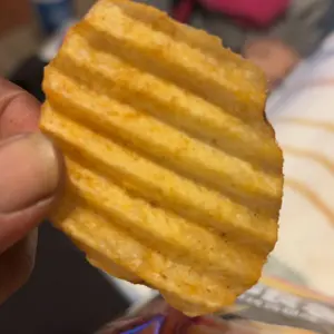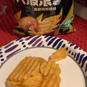 Introducing Lay's Wavy Chips in Roasted Chicken Wing flavor, a crispy and satisfying snack for any occasion. These chips feature wide ripples and a strong yellow color, with a good smattering of seasoning on the surfaces.